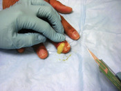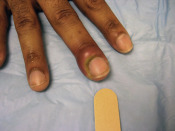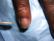 Successful drainage of an acute paronychia following the insertion of a scalpel under the proximal nail fold just above the nail.