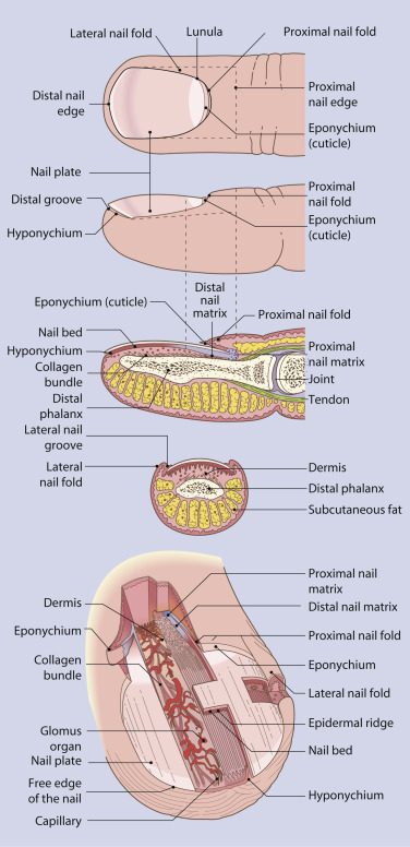 The nails are unique from other appendages in that they often offer a glimpse into systemic conditions. Therefore, a fundamental understanding of nail unit anatomy is essential to appreciate nail abnormalities and their relationship to systemic diseases ( Fig. 44-1 ). The nail apparatus is composed of a hard and durable nail plate that lies above the nail bed and the distal portion of the nail matrix, which is seen distally as the white “half-moon”-shaped area known as the lunula. The remaining part of the matrix lies below the proximal nail fold. The undersurface of the proximal nail fold forms the eponychium (cuticle). The nail bed lies beneath the nail plate and above the distal phalanx. Due to its rich blood supply, the nail bed appears as a reddish area extending from the lunula to the area just proximal to the free edge of the nail. The proximal and lateral nail folds border the nail plate, and the hyponychium is the area under the free edge and the distal portion of the nail plate. The blood supply to the nail arises from the superficial and deep palmar branches of the digital arteries.