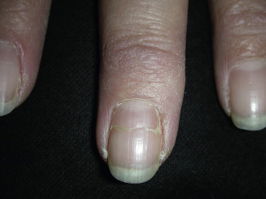 | Pterygium inversum (ventral) | Fusion of hyponychium to distal nail plate | Systemic sclerosis; stroke; acrylate allergy; trauma; systemic lupus erythematosus |