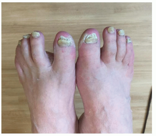 Patients present with a variety of examination findings depending on the clinical subtype of onychomycosis. Common presentations include nail thickening, distal or lateral onycholysis, subungual keratinaceous debris, focal leukonychia, yellow or brown discoloration of the nail, proximal white subungual streaks, complete nail crumbling, and periungual scaling.