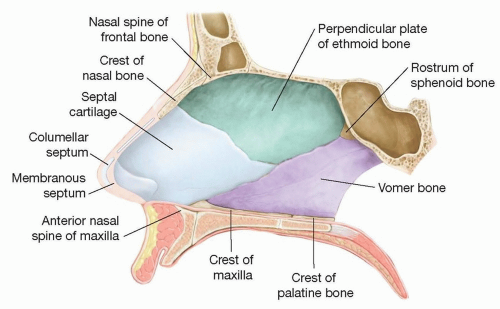 The nasal septum comprises cartilaginous, membranous, and bony components (perpendicular plate of the ethmoid, vomer, premaxilla, maxillary crest, and palatine crest) covered by mucoperichondrium and mucoperiosteum layers (FIG 1). The septum is typically 2 to 4 mm thick.