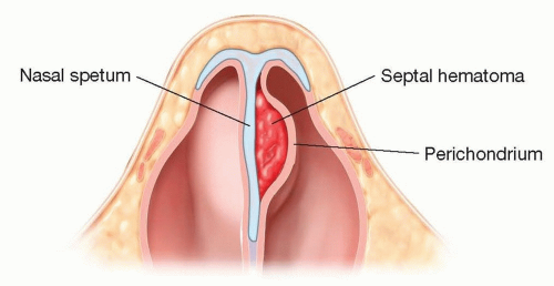 Bleeding into the potential space between the cartilage and its overlying mucoperichondrium leads to a septal hematoma (FIG 2), whereas external bleeding from Kiesselbach plexus results in epistaxis.