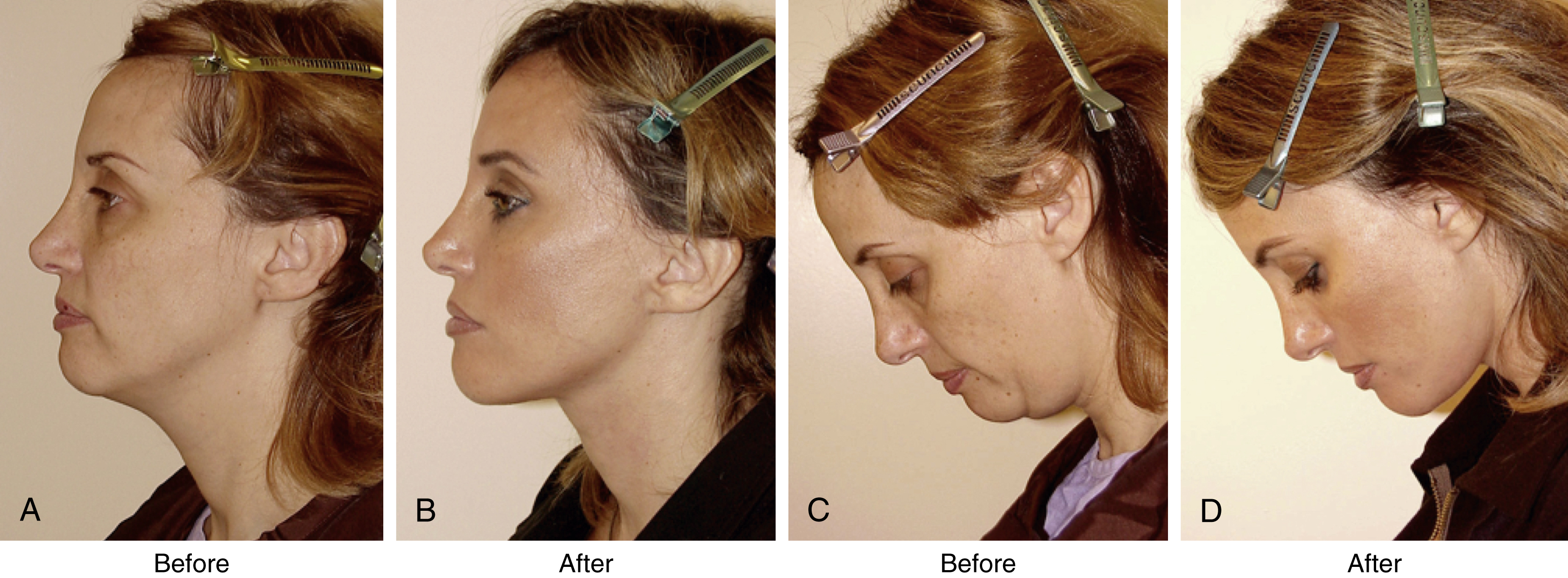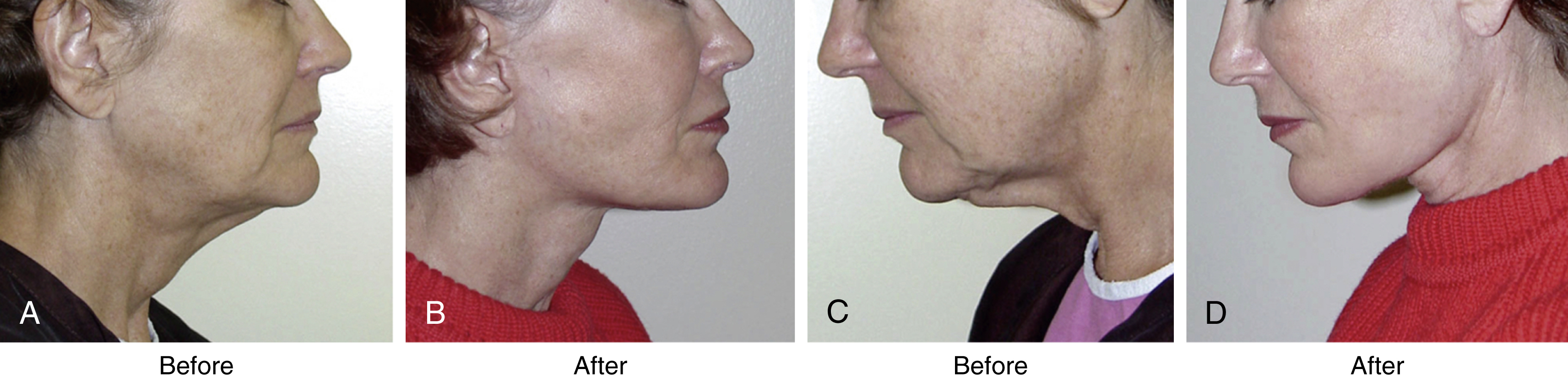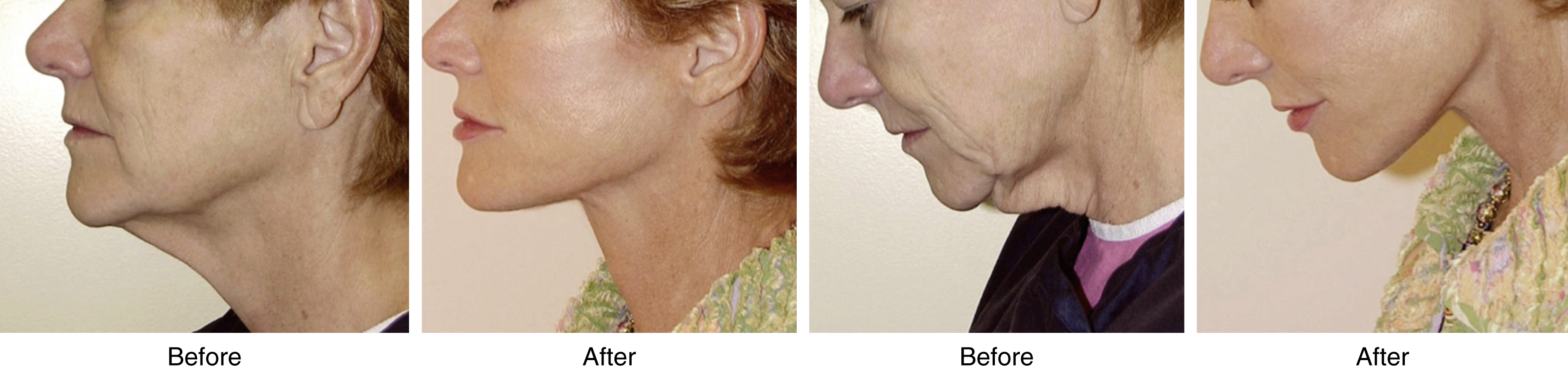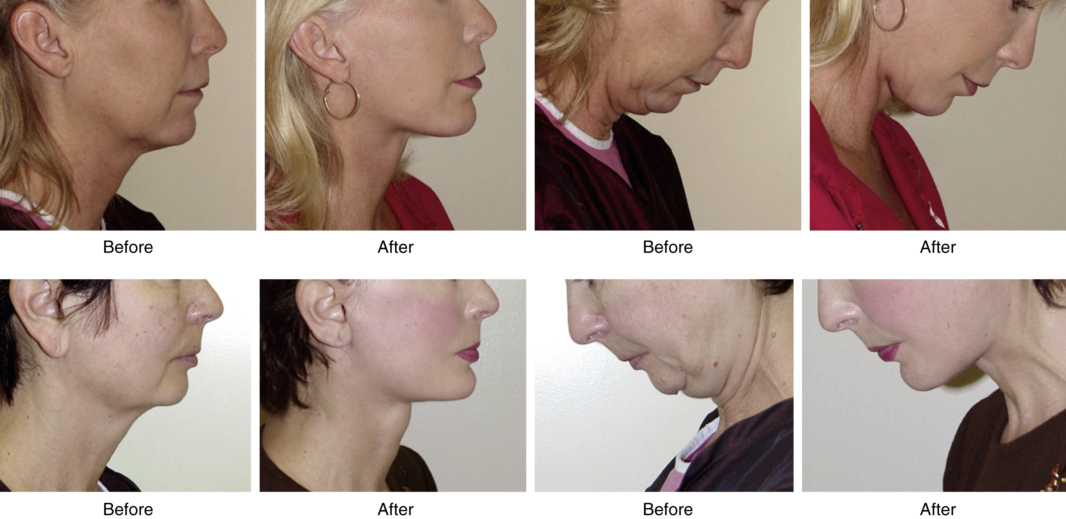 Submental liposuction (and arguably “noninvasive” treatments including cryolipolysis, deoxycholic acid injections, and radiofrequency and ultrasound “skin shrinking” treatments) is the simplest and likely the most commonly performed procedure to improve neck contour in the range of options available to patients. It does not constitute a true neck lift, however, and only occasionally produces optimal outcomes. Patients and surgeons are predictably drawn into a sense of denial of this, however, by the fact that submental liposuction will occasionally produce worthwhile improvement in some cases, and it is these atypical outcomes that are predictably displayed in offices, placed in advertisements, shown on TV and websites, published in the beauty press, and even included in presentations at plastic surgery symposia. Adding to the deception is the fact that these photographs have usually been taken in the early postoperative period when swelling is still present that obscures irregularities and underlying but untreated deep layer problems.