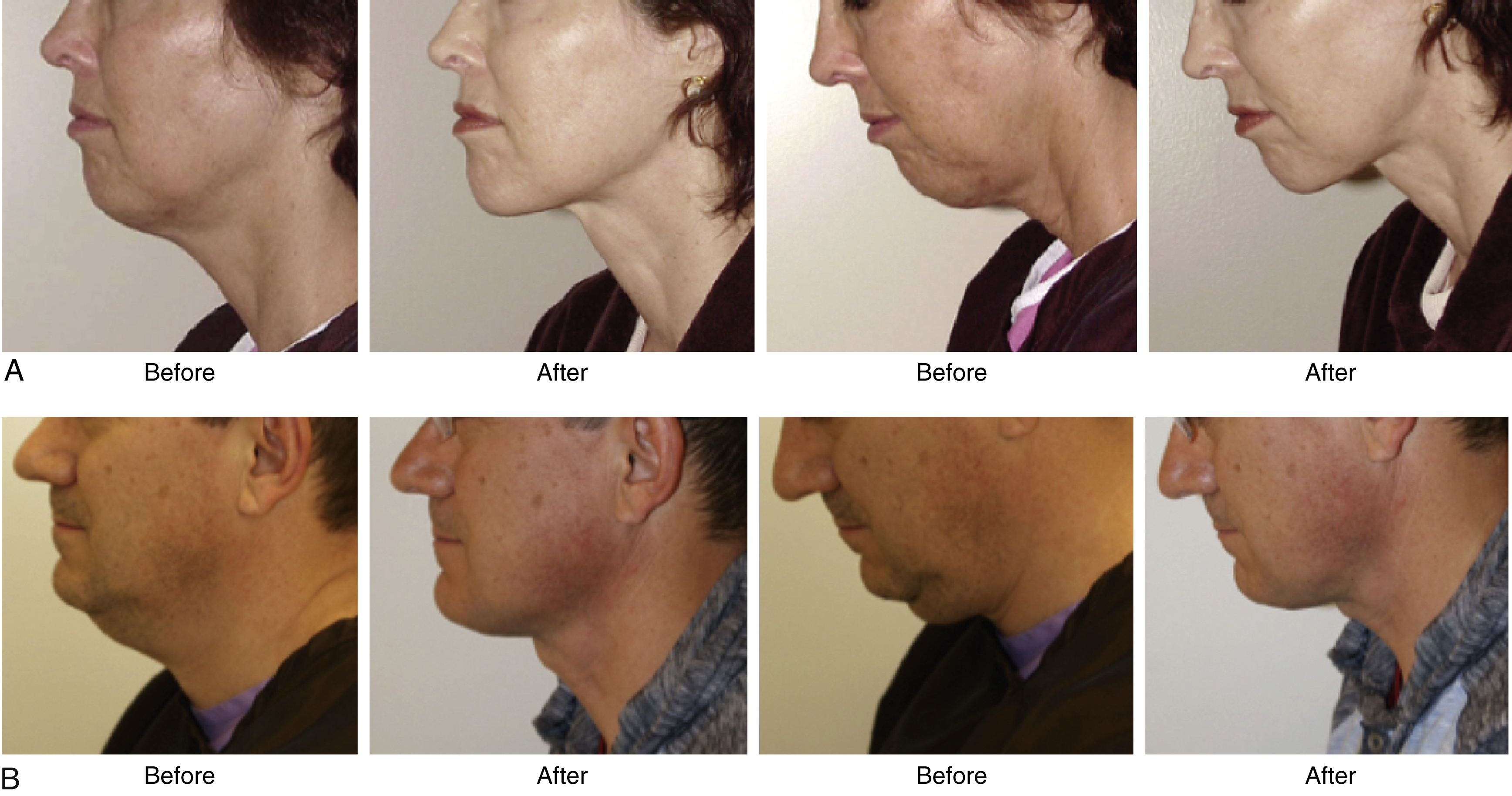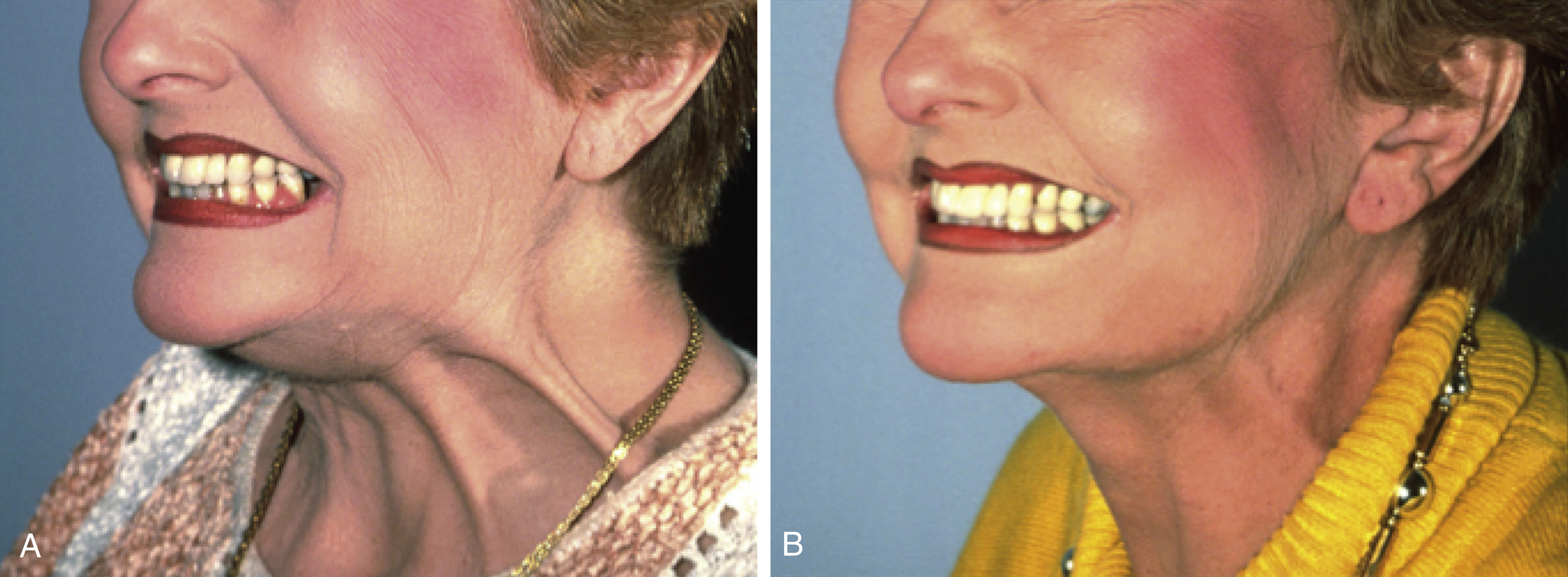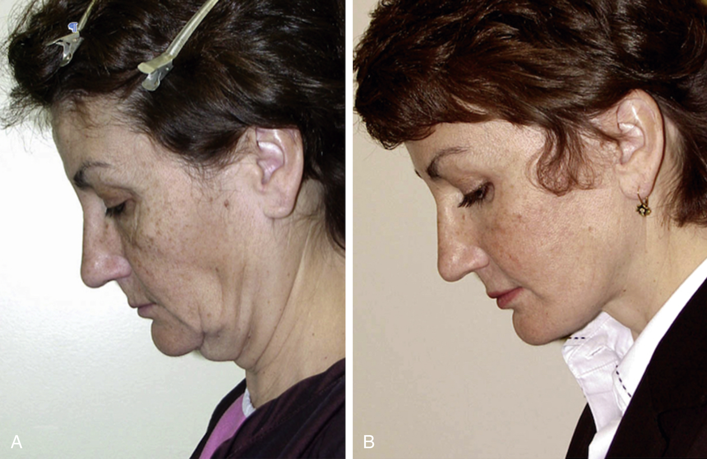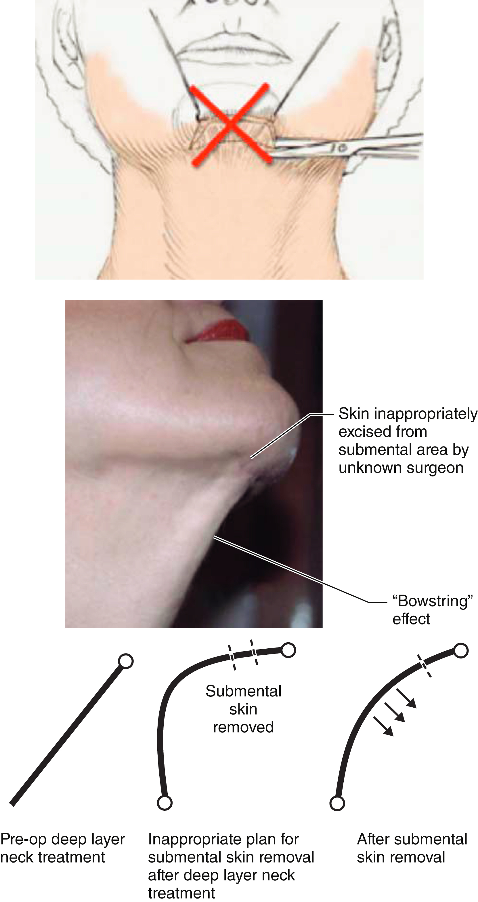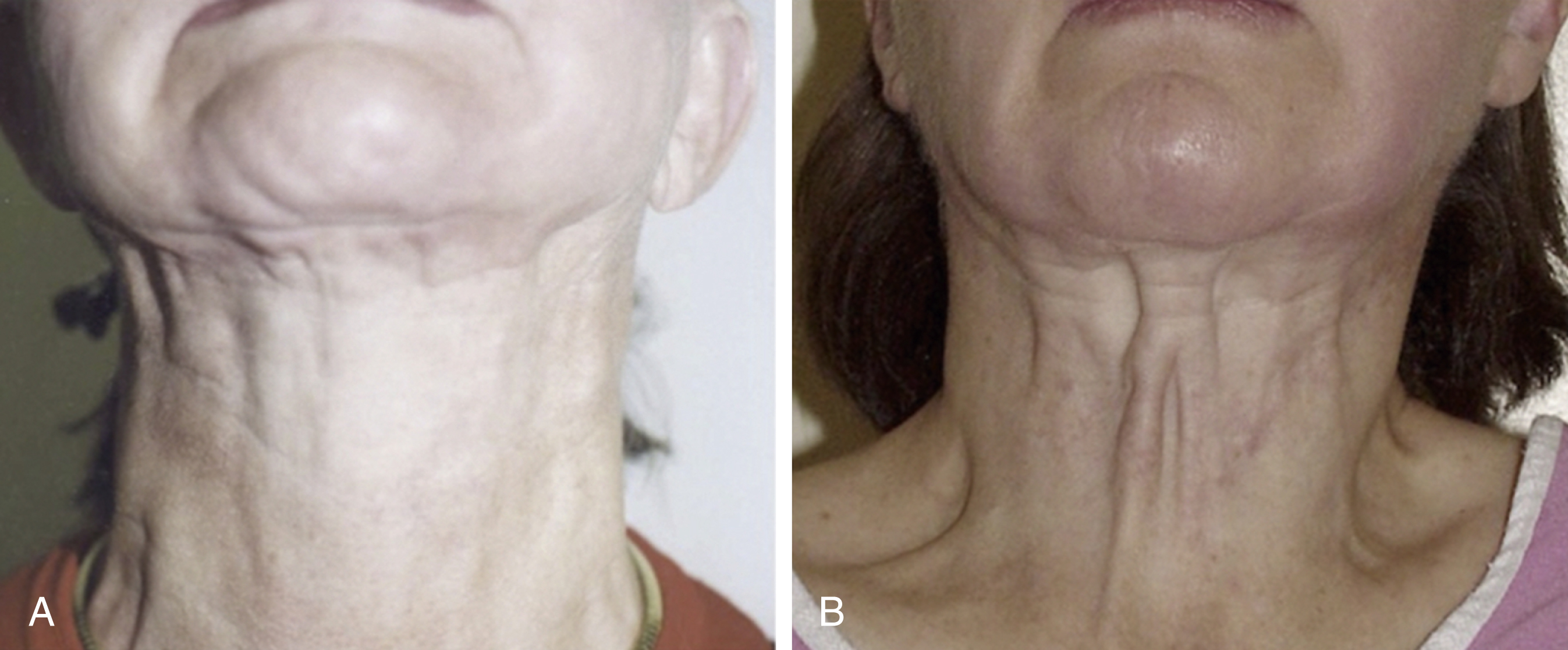 Submental liposuction (and arguably “noninvasive” treatments including cryolipolysis, deoxycholic acid injections, and radiofrequency and ultrasound “skin shrinking” treatments) is the simplest and likely the most commonly performed procedure to improve neck contour in the range of options available to patients. It does not constitute a true neck lift, however, and only occasionally produces optimal outcomes. Patients and surgeons are predictably drawn into a sense of denial of this, however, by the fact that submental liposuction will occasionally produce worthwhile improvement in some cases, and it is these atypical outcomes that are predictably displayed in offices, placed in advertisements, shown on TV and websites, published in the beauty press, and even included in presentations at plastic surgery symposia. Adding to the deception is the fact that these photographs have usually been taken in the early postoperative period when swelling is still present that obscures irregularities and underlying but untreated deep layer problems.