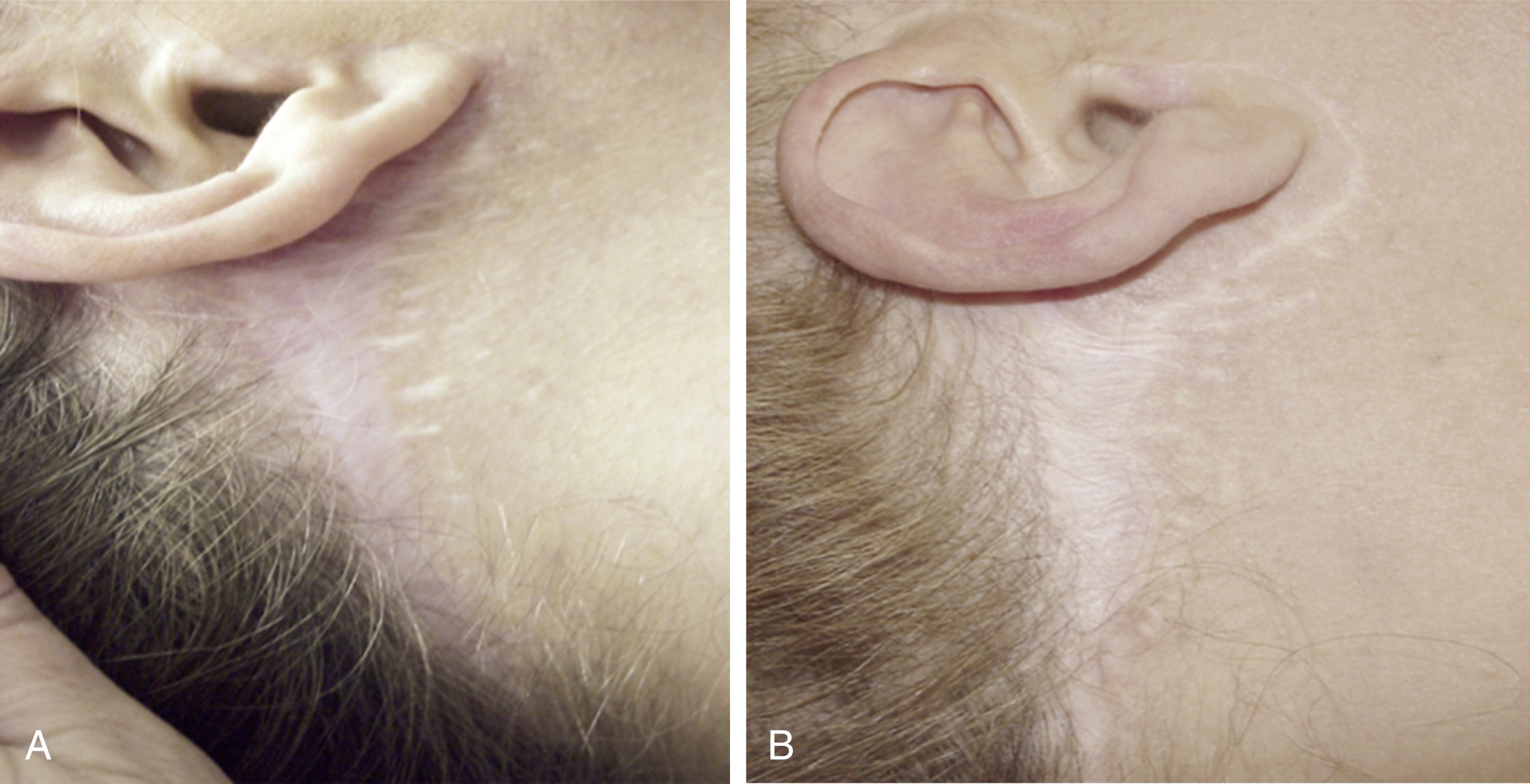 Liposuction, in combination with ill-conceived overtightening of neck skin, can add the additional objectionable problems of hairline displacement and wide postauricular scars, and compound the overall deformity ( Fig. 67.5 ).