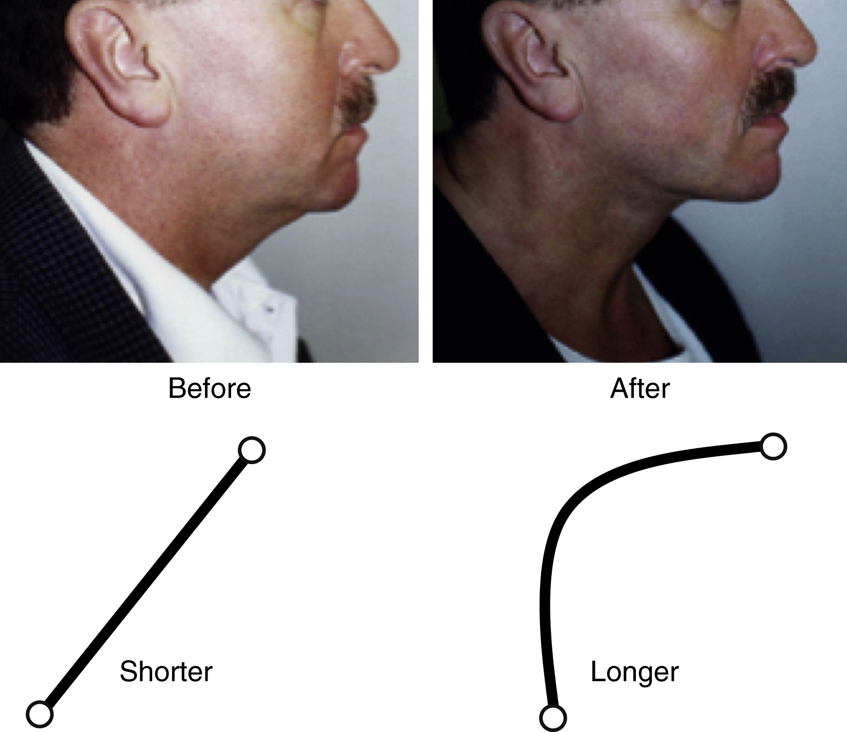 This is due to the fact that, unlike liposuction, a neck lift performed through a submental incision allows deep layer problems (subplatysmal fat excess and submandibular gland enlargement) and platysmal laxity typically present in the majority of patients seeking neck improvement to be addressed. This, however, begs the question, how can good neck contour be created without removing and tightening the skin, and what happens to the “excess” skin if only the deeper layer treatment is made and no skin is excised? The answer to this question is twofold. First, is the simple but often difficult to accept concept that in a properly performed neck lift contour is created by modification of deep layers of the neck and not by tightening of the skin, the covering layer. Skin stretches and relaxes, as we move and express ourselves; it is not intended to be a structural supporting layer, to hold up sagging muscle, fat and/or lift hypertrophied structures lying beneath it. The second part of the answer lies in the increase in neck surface area that occurs when deep neck contour is improved. Improving neck contour by excising redundant subplatysmal fat and performing other deep layer maneuvers as indicated, followed by the removal of lax platysma, will result in a deepened cervicomental angle, a longer curvilinear distance from the mentum to the sternal notch, a more concave, geometrically larger and longer neck surface ( Fig. 67.7 ). When neck skin is redraped and redistributed over the deeper, more concave surface, “excess” skin is absorbed and none need be removed.