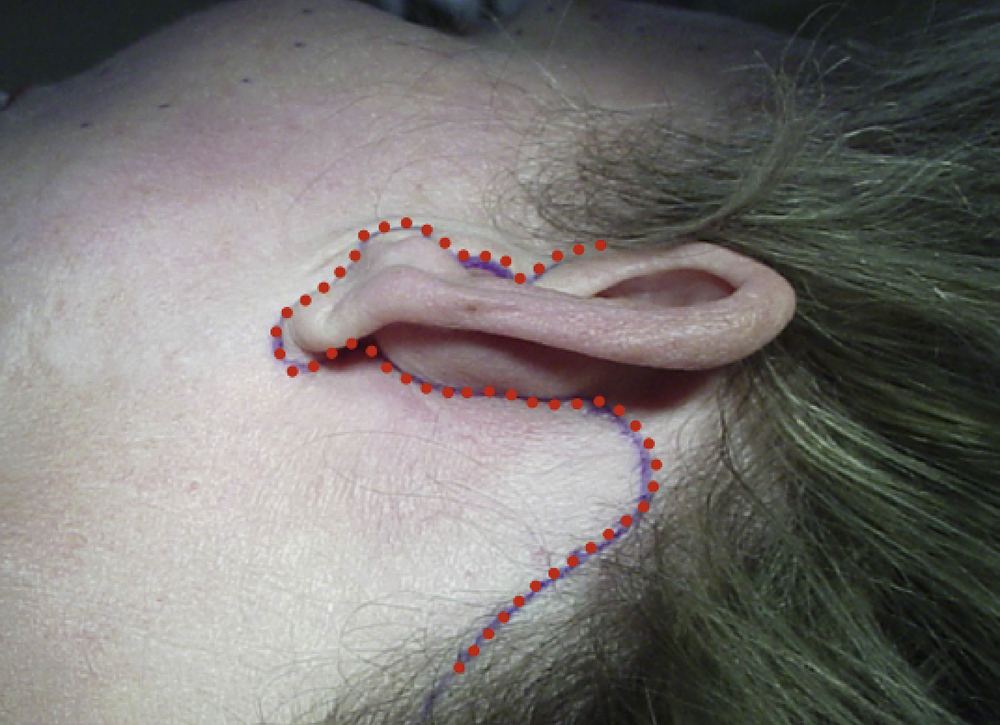 The incision should be approximately 3–3.5 cm in length, but may be made longer, as long as neither end will be advanced up upon a visible portion of the face when skin flaps are shifted. Healing will be best, and the scar will be best concealed, if it is made as a straight, and not as a curved line ( Fig. 67.17 ).