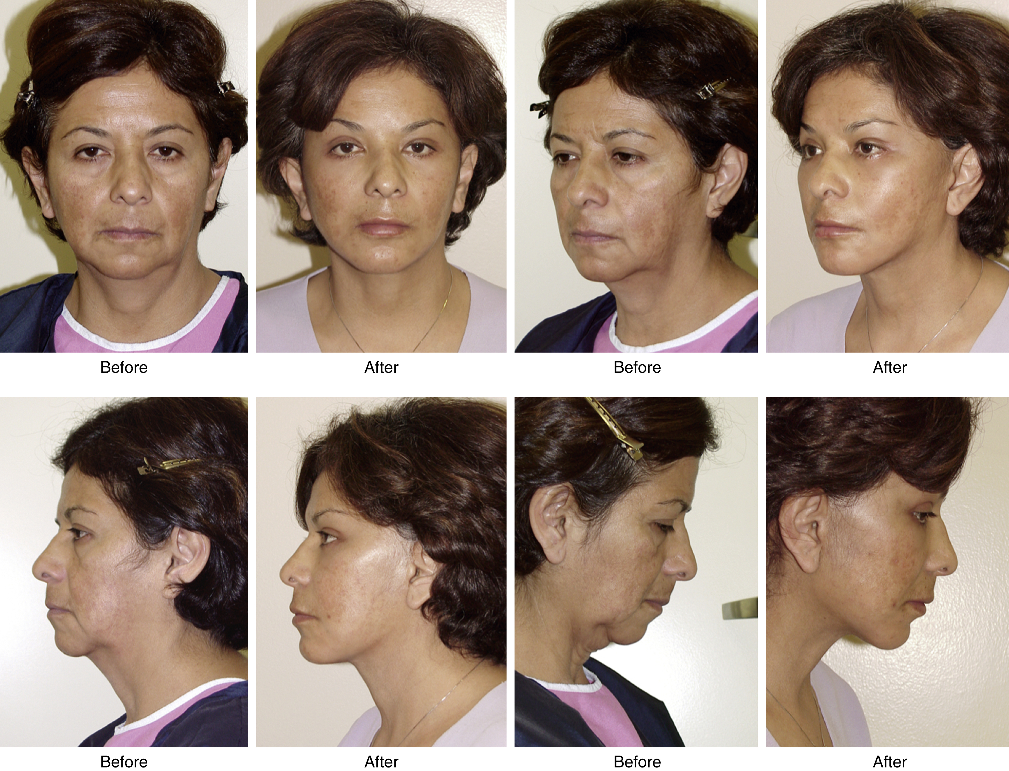 Combining a facelift with a neck lift is almost always the best approach to obtain a balanced, natural, and harmonious rejuvenation of the female face, although not all patients will recognize or accept this (see Fig. 67.12 ). Performing a facelift in combination with a neck lift also allows for more complete and comprehensive removal of neck skin. And while many men will be put off by the idea of a “facelift,” they will readily agree to undergo the more palatable sounding “extended neck lift” procedure.