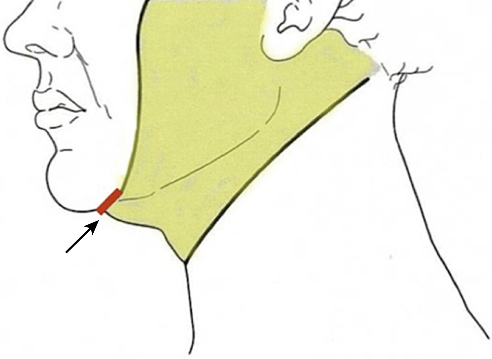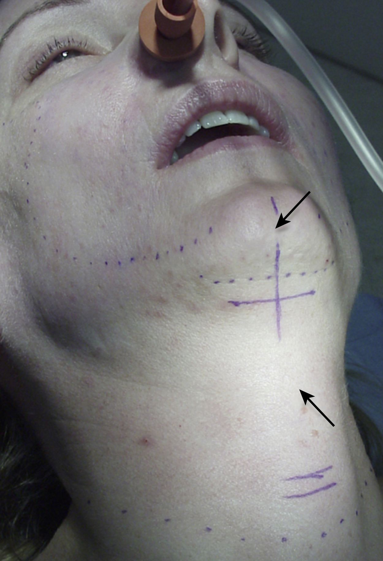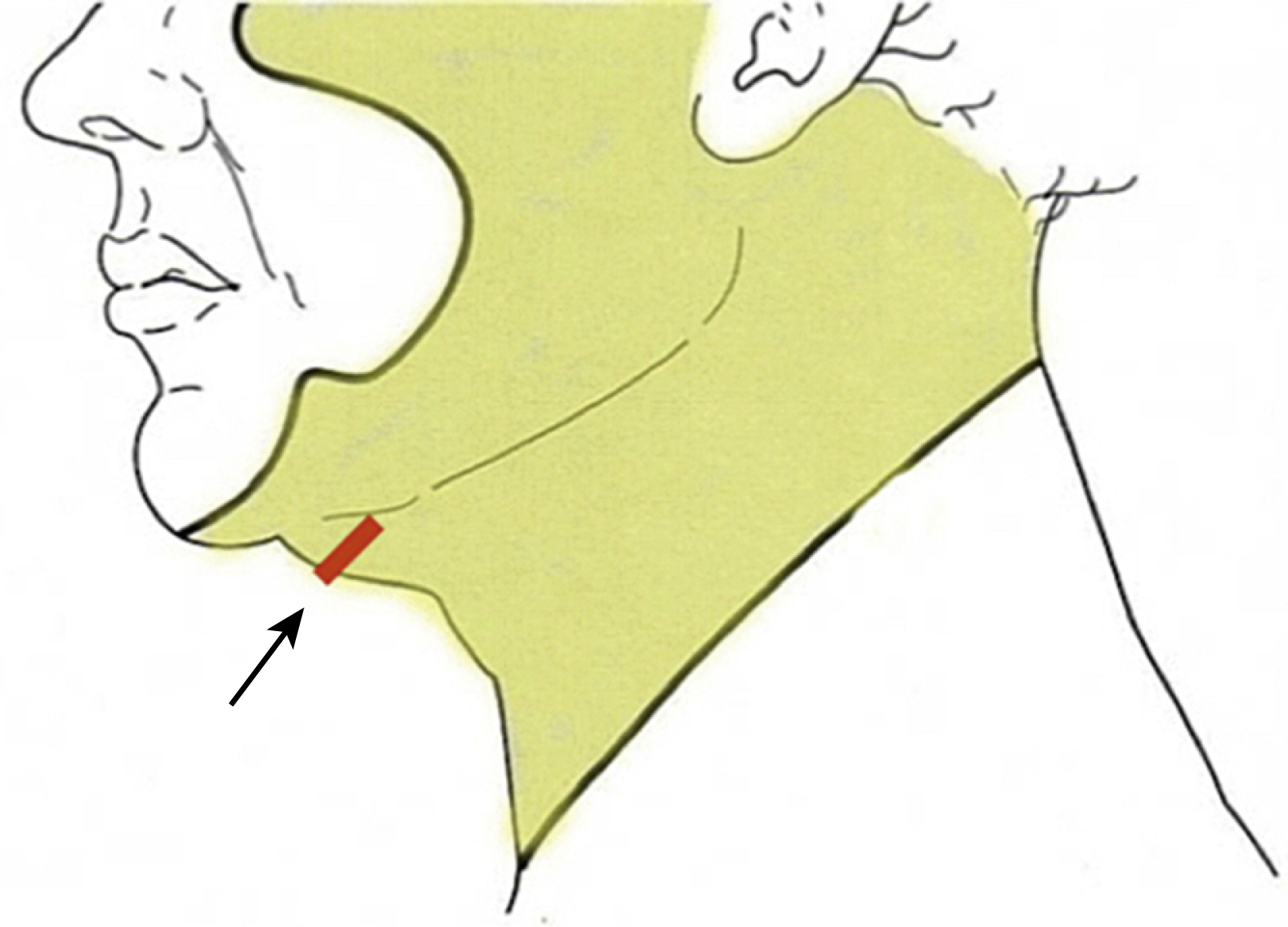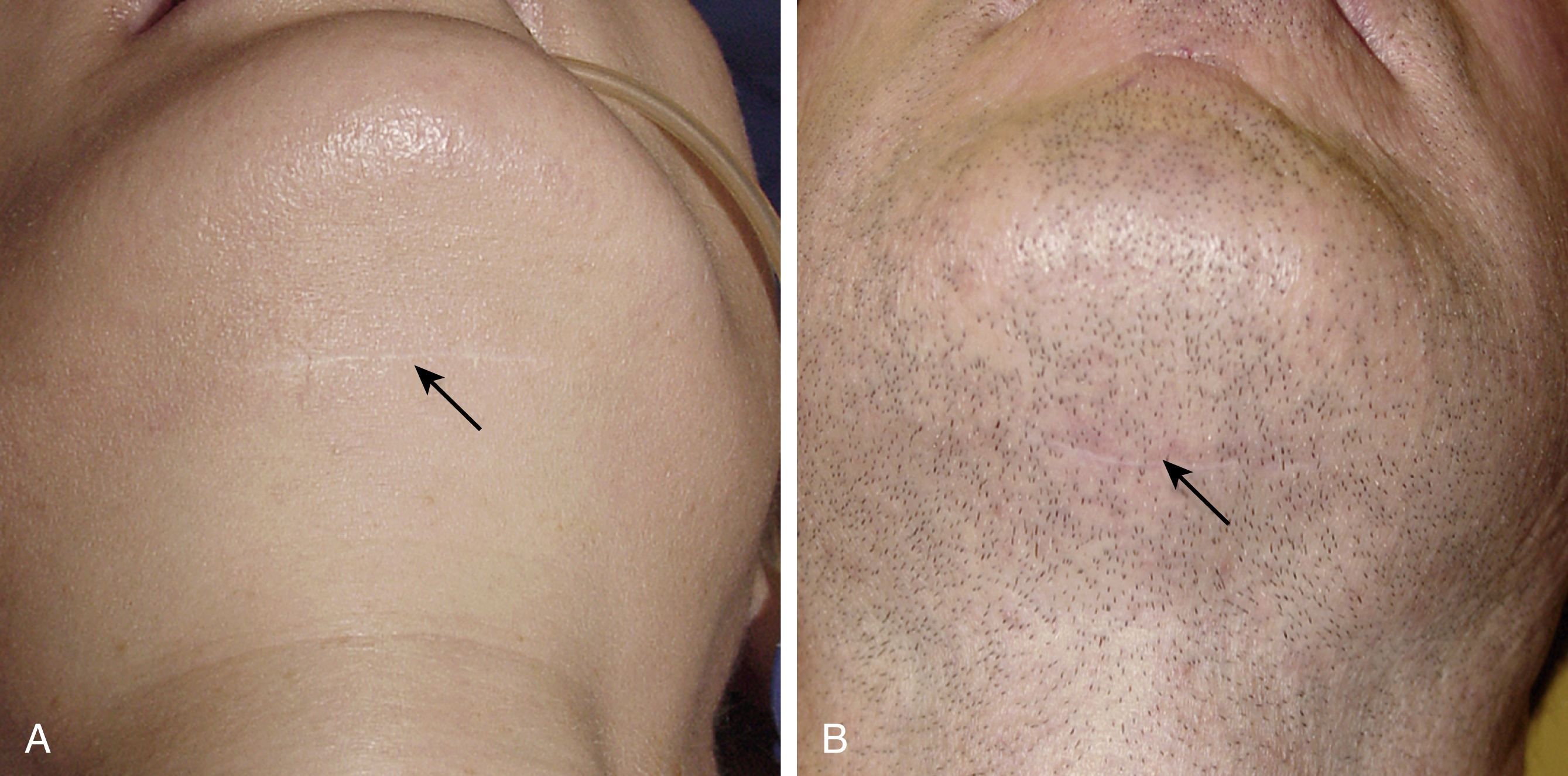 This, however, will surgically reinforce the crease and accentuate a “double chin” or “witch’s chin” deformity. Exposure of the submental region will also be compromised, and difficulty will be encountered when suturing or dissecting low in the neck. A more posterior placement of this incision will eliminate these problems, but still result in an inconspicuous and well-concealed scar ( Figs. 67.14–67.16 ).