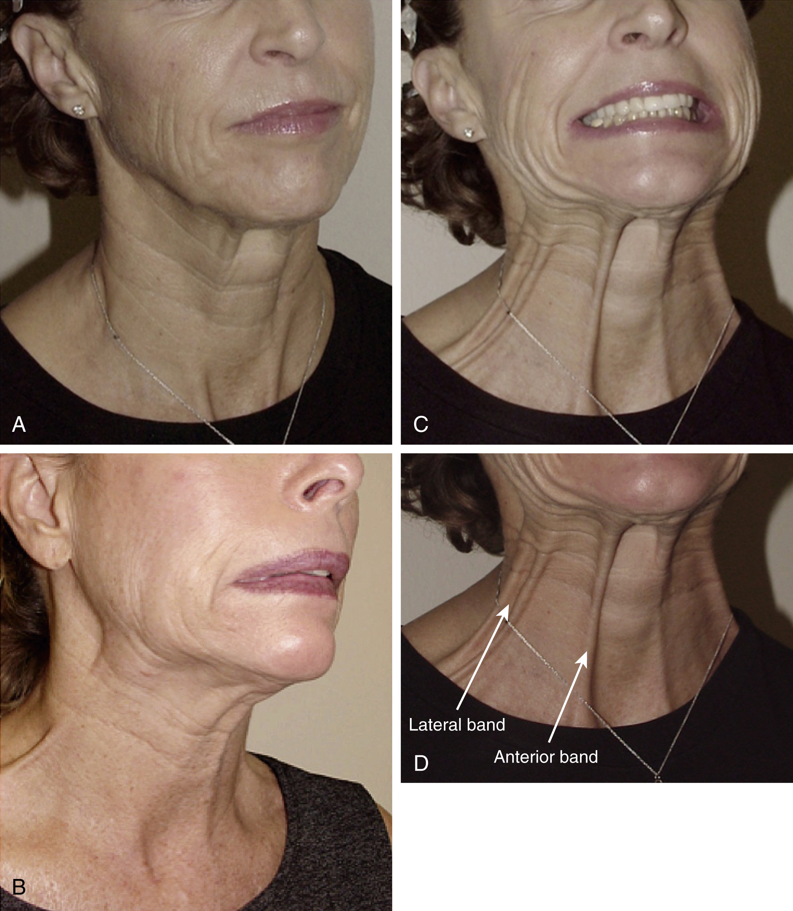 Examination of the cervicosubmental region with and without platysmal activation allows one to distinguish between “hard” dynamic and “soft” a dynamic cervical bands. Soft, adynamic bands change little during platysma activation and are predominantly a problem of loose skin or horizontal platysmal laxity. Hard dynamic bands become tight or exaggerated upon platysmal activation and indicate a problem of longitudinal platysmal hyperfunction.