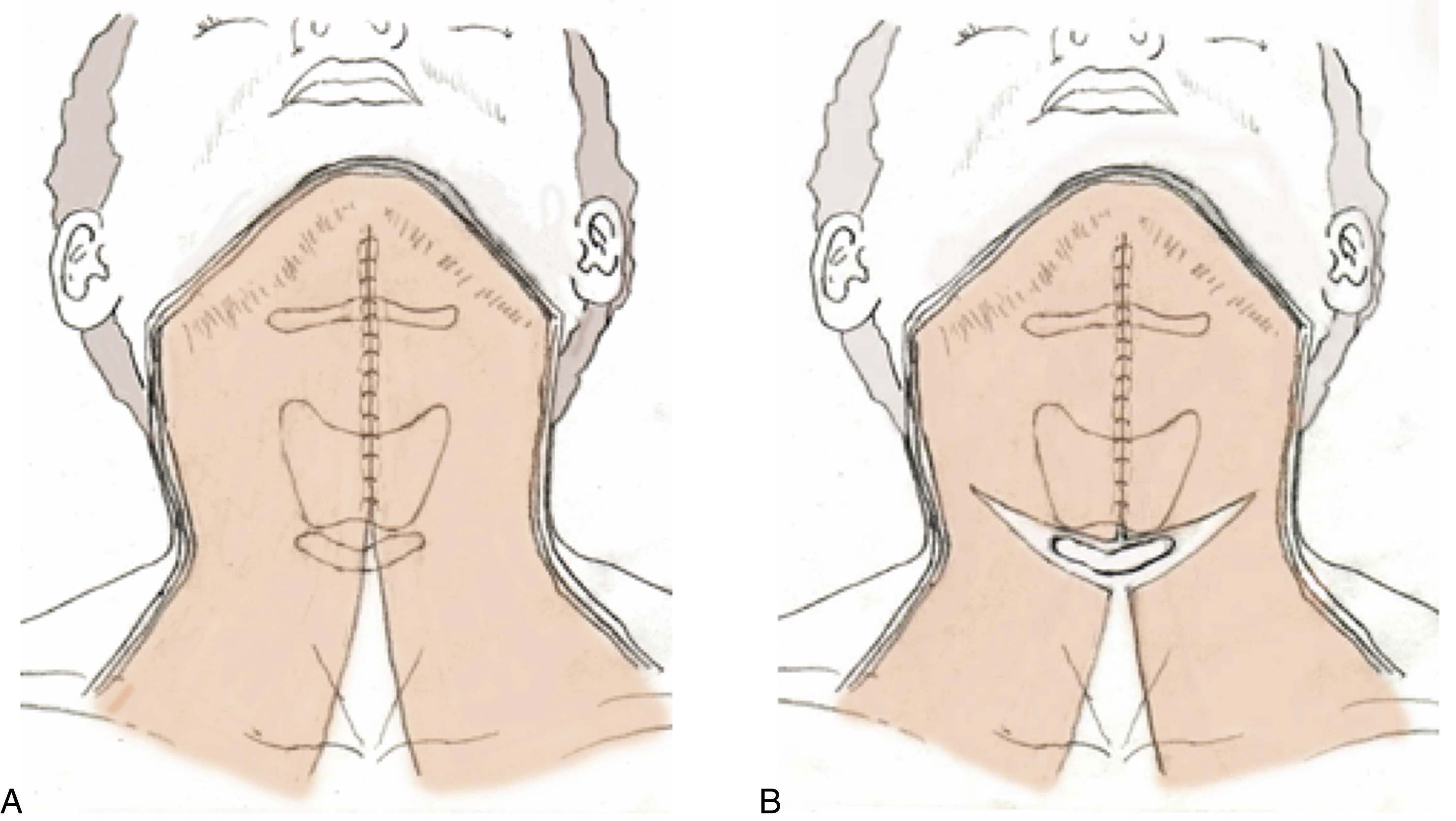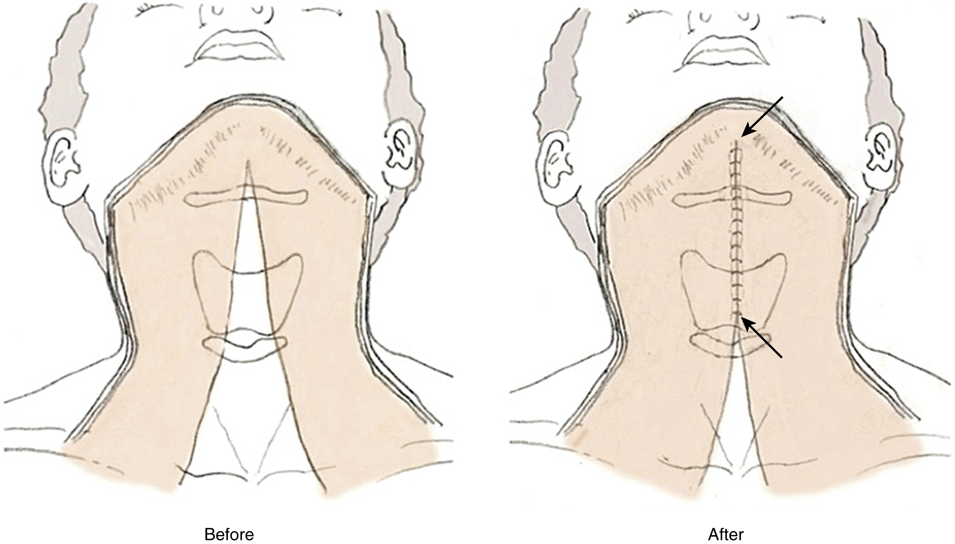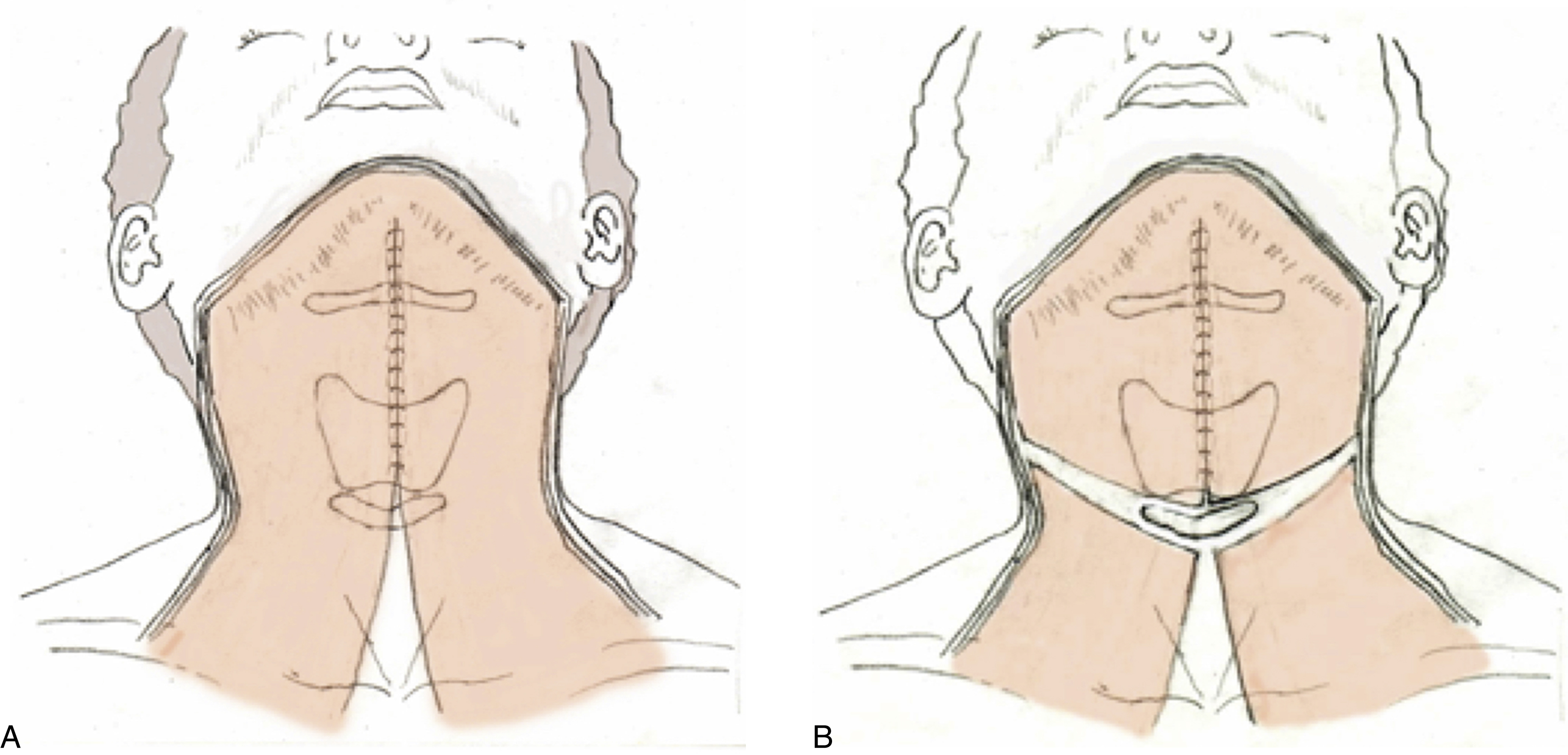 Medial wedge resections of platysma at the hyoid can result in unesthetic exposure of underlying cervical anatomy, a harsh transition from the submental region to the neck, as well as lower lip dysfunction and asymmetric smile. These procedures are not recommended in routine treatment of platysmal bands although they may be useful in certain secondary cases and in situations where there has been fibrosis and scarring of the platysma in that area. These problems can result from noninvasive treatment of the neck with radiofrequency, ultrasound, internal tissue heating, cryolipolysis, chemolipolysis, laser liposuction, and the use of inflammatory fillers in the neck area. When these problems are present a “high” myotomy (division at the level of the thyroid cartilage rather than the cricoid), or even a partial myectomy (excising damaged platysma muscle from the anterior neck at the level of the thyroid cartilage) may be indicated.