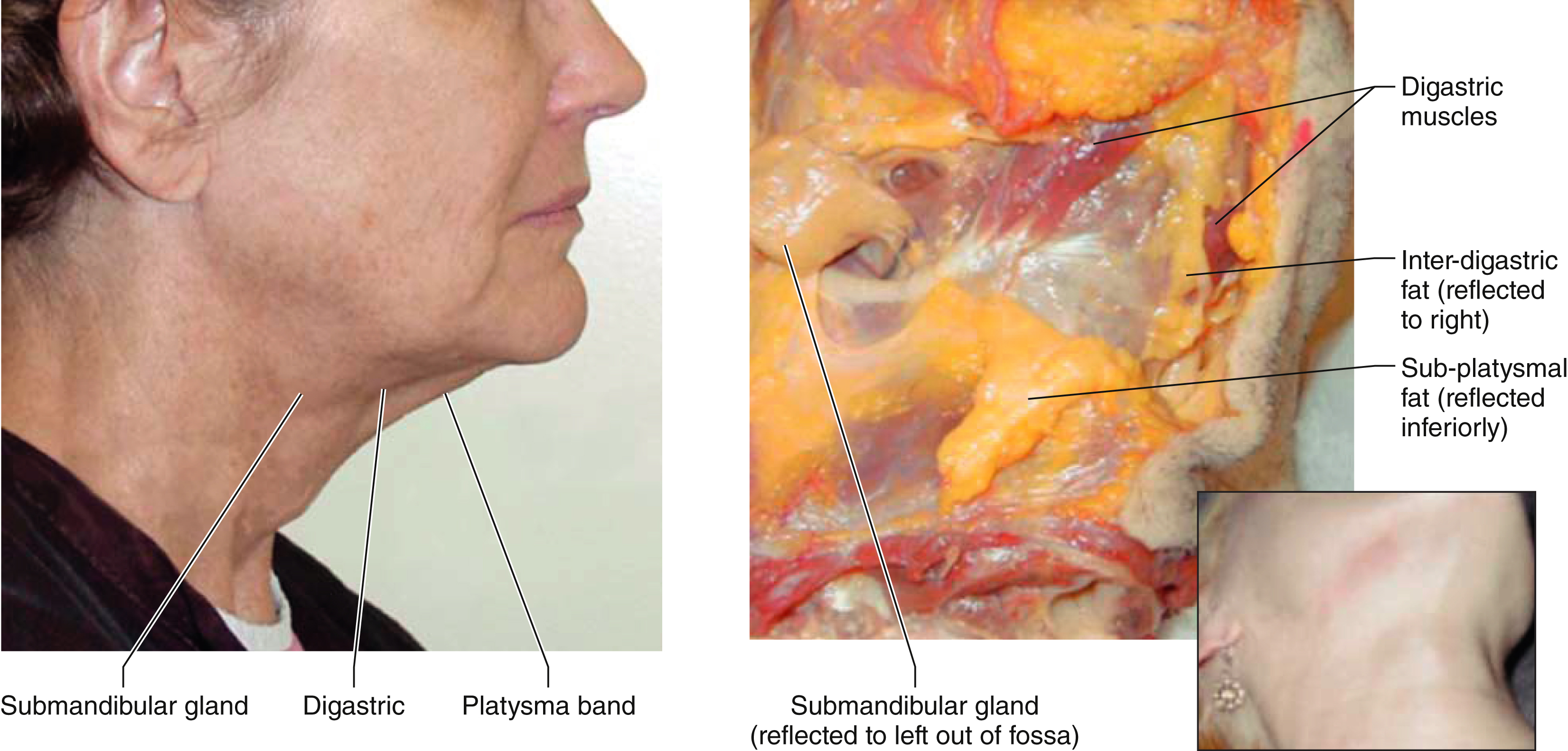 So how should one perform a neck lift? Perhaps it is easiest to start by stating what not to do. Despite the fact that it is the traditional approach and remains a common practice, it is not enough to perform submental liposuction and tighten the skin in most patients. This approach ignores a number of anatomical problems present in many patients seeking neck improvement, including platysmal laxity, platysmal bands, excess subplatysmal fat, large submandibular glands, digastric muscle hypertrophy, and developmental factors such as the size and shape of the bony jaw and chin. Removing subcutaneous fat and tightening skin over these problems does not correct them, and the presence or absence of each must be looked for in order to create and apply an appropriate surgical plan ( Fig. 67.2 ).