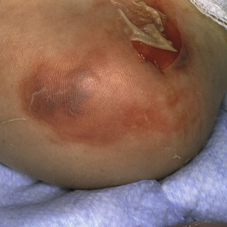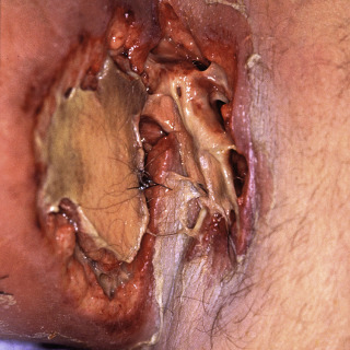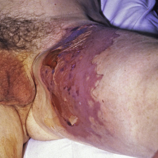 Necrotizing fasciitis is a life-threatening infection of the skin that involves the deep subcutis and superficial investing fascia. Fournier gangrene represents necrotizing fasciitis of the genitalia and perineum. The current trend is to refer to these conditions, in general, as necrotizing soft tissue infections (NSTIs). Although laypersons may refer to the condition as “flesh-eating Strep,” and some cases are due to Streptococcal spp. and/or a single organism, most cases are polymicrobial in nature. Cases of necrotizing fasciitis have been attributed to a number of organisms, including Streptococcus pyogenes, Staphylococcus aureus, Bacteroides fragilis, and Clostridium, Haemophilus, Vibrio, and Prevotella spp. Other rare bacteria and even fungi may be involved in some cases of necrotizing fasciitis.
