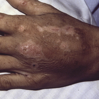 Patient with large linear ulcerated lesion on the dorsum of the hand. The lesion was acquired in Colorado, with no known source.