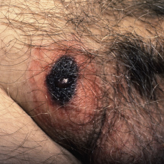 Patient with ecthyma gangrenosum, with black eschar and rim of erythema.