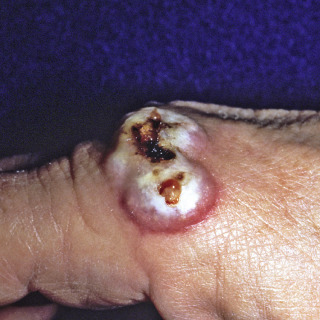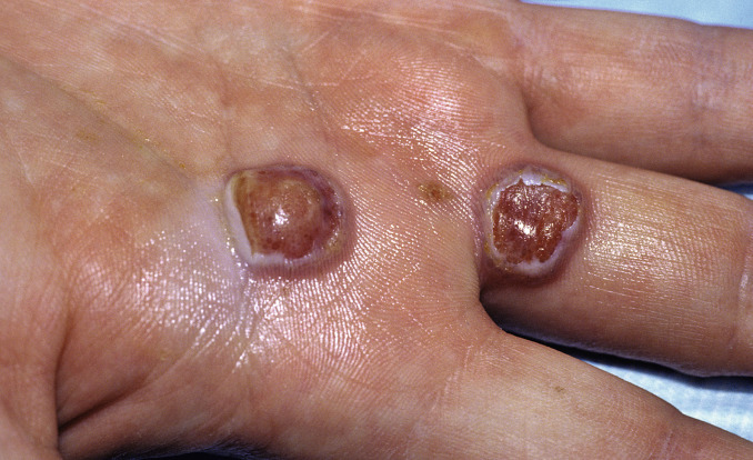 Two superficially ulcerated nodules typical of orf. This was acquired from digging in the backyard of the patient’s home in Colorado that had been built on the site of an old sheep ranch. It is important to realize that the virus can remain dormant in the soil and on fomites for decades.