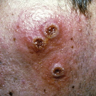 Three ulcerated nodules on the left cheek of a young man from Texas. The source of the infection was never identified.