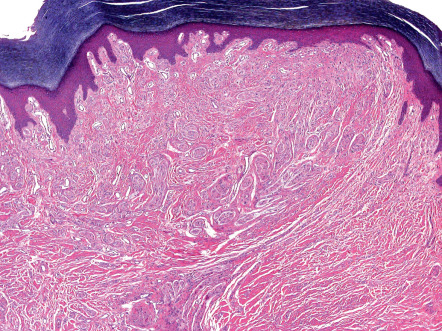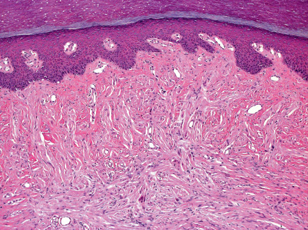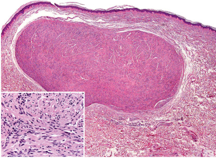 Solitary PENs are well-circumscribed, ovoid or round tumors located in the mid dermis, although some lesions may extend into the subcutis. The tumor appears encapsulated by a thick condensation of collagen fibers that surround it, and there is often some clefting from the adjacent dermis ( Fig. 115.5 ). The parenchyma is composed of interwoven fascicles of spindled cells. The fascicles are compactly and relatively uniformly arranged, separated only by clefts. There is no evidence of extensive fibrosis, inflammation, granulation tissue, degenerative changes or foreign bodies, in contrast to traumatic neuromas .