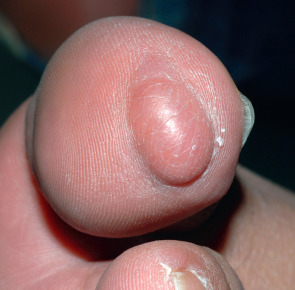 In neonates and young infants, lesions may be located on the lateral surface of a normal digit, most commonly the ulnar side of the fifth digit. Here, they represent amputation neuromas secondary to amputation in utero of supernumerary digits (see Ch. 64 ). These tumors are occasionally referred to as “rudimentary supernumerary digits”; however, on histologic examination, they contain neither normal nor rudimentary elements of a digit.