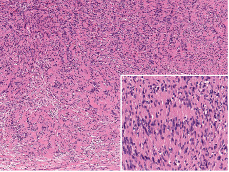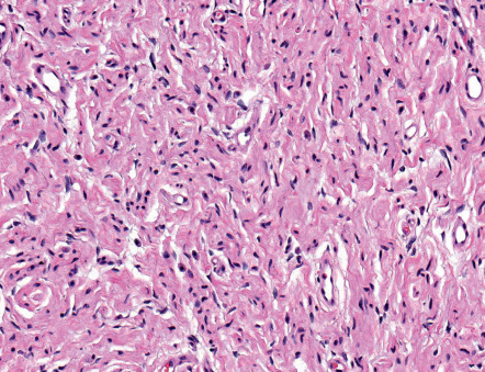 | Architecture | Chaotic, poorly organized tangle of fascicles of various sizes and shapes | Compactly arranged fascicles; frequent clefts between fascicles | Hypercellular areas (Antoni A), fascicles in various patterns, hypocellular areas (Antoni B), edematous, myxoid | Fine fibrillary lattice of haphazardly arranged spindle cells in variably dense matrix |