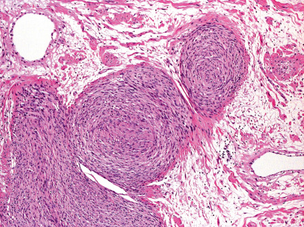Traumatic or amputation neuromas are usually well-circumscribed nodules located at any level of the dermis or the subcutis. They are encased by a fibrous sheath, although the distal end can be poorly defined. The proliferation is composed of a chaotic, poorly organized tangle of fascicles of various sizes and shapes ( Fig. 115.3 ). Between the fibers are variable amounts of fibrous tissue with or without inflammatory cells or mucin . The constituent cells are Schwann cells and perineurial cells with spindle-shaped nuclei and cytoplasm ( Fig. 115.4 ). Special stains show many axons in an irregular, haphazard pattern .