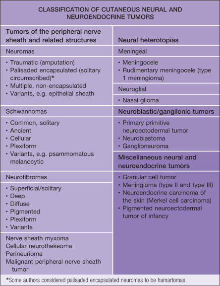 Cutaneous neural tumors can be classified into two major groups: those derived from peripheral nerves and those derived from ectopic or heterotopic neural tissue ( Table 115.1 ). The former group is often subdivided into true nerve sheath neoplasms and hamartomatous tumors, although this classification may not be universally accepted .