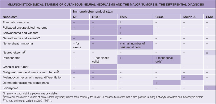 | Traumatic neuroma | Palisaded encapsulated neuroma (PEN) | Schwannoma (neurilemmoma) | Neurofibroma | Nerve sheath myxoma * | Cellular neurothekeoma * | Granular cell tumor | |