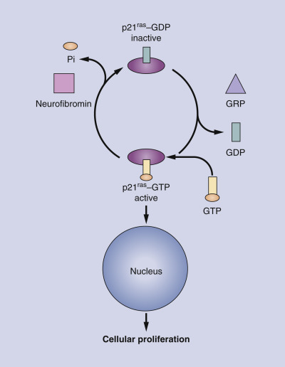 The NF1 gene has been localized to chromosome 17q11.2. The basic defect lies in the abnormal expression of a tumor suppressor gene called neurofibromin. This gene product has functional and structural homology with a guanosine triphosphatase-activation protein (GTPase) that downregulates p21 ras proto-oncogene activity. In its active (GTP) state, the p21 ras protein binds guanine nucleotides with high affinity, acting as a signal transducer for cellular proliferation. Neurofibromin switches off this signaling by hydrolyzing GTP to guanosine diphosphate ( Fig. 40-1 ). A defect in neurofibromin would result in a constitutively active p21 ras protein leading to cell growth and possible tumor formation. Interestingly, neurofibromin is found in the skin, brain, spleen, liver, and muscle, not just in the neural crest cells. The abnormal proliferation seen in neurofibromatosis is focused on the neural crest for reasons that are not yet clear at the molecular level.
