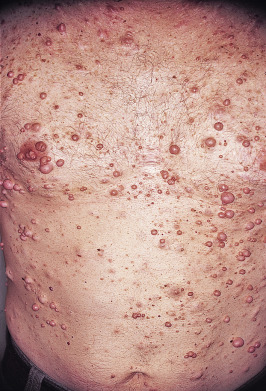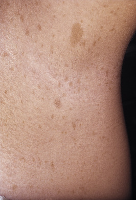 The freckle-like pathognomonic lesions (Crowe’s sign) ( Fig. 40-2 ) generally occur between 3 and 5 years of age in the axillae and/or groin. Around 90% of adults have the freckling. These freckles are typically small, distinguishing them from café-au-lait macules. Other involved areas include the area above the eyelids, around the neck, and submammary region in females.
