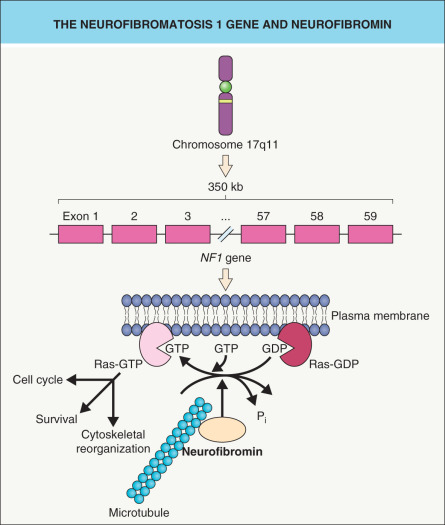 Sequence similarities between a central 300–400 amino acid domain within neurofibromin and G TPase- a ctivating p roteins (GAPs) led to recognition of neurofibromin’s role in the negative regulation of the Ras– m itogen- a ctivated p rotein k inase (MAPK) pathway that promotes cell survival and proliferation (see Fig. 61.1 and Fig. 55.4 ) . Like all G proteins, Ras activity requires GTP. Neurofibromin and other GAPs accelerate the hydrolysis of GTP to GDP, thereby terminating the Ras signal and functioning as tumor suppressor proteins. Neurofibromin also associates with microtubules , although the consequences remain unclear.