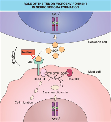 As observed in other autosomal dominant genodermatoses (e.g. basal cell nevus syndrome) caused by a defective tumor suppressor gene, a somatic “second hit” mutation inactivating the remaining allele of the gene (i.e. causing loss of heterozygosity [LOH]) can be found within skin lesions of NF1. Biallelic NF1 inactivation has been identified in Schwann cells from neurofibromas as well as melanocytes from café-au-lait macules in patients with NF1 . In a mouse model, Nf1 nullizygosity ( Nf1 −/− ) in Schwann cells was shown to be necessary, but not sufficient, for neurofibroma formation ; however, plexiform neurofibromas did arise from Nf1 −/− Schwann cells when the microenvironment included Nf1 +/− (rather than wild-type) mast cells . The latter cells appear early in neurofibroma development and are hypermotile in response to the c-Kit ligand (stem cell factor), which is oversecreted by Nf1 −/− Schwann cells. Once recruited, mast cells produce growth factors that likely promote neurofibroma tumorigenesis ( Fig. 61.2 ). Of note, genetic or pharmacologic attenuation of kit signaling in Nf1 +/− mast cells has been found to diminish neurofibroma initiation and progression (see Treatment section below).
