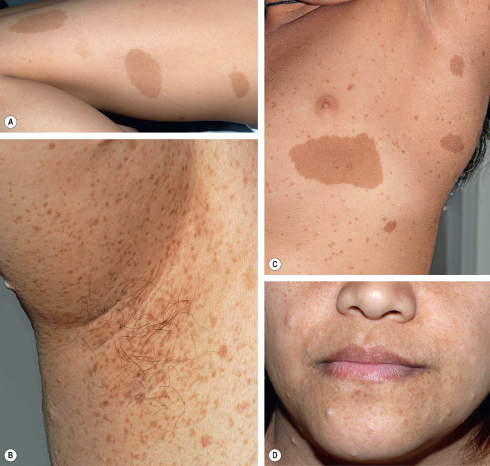 “Freckling” in the axillae and groin in NF1 patients was first noted by Crowe and is referred to as “Crowe’s sign” (see Fig. 61.3 ). Numerous 1–3 mm brown macules (more akin to lentigines than ephelides) typically populate these intertriginous zones, the neck, and, occasionally, the majority of the skin surface (see Figs 61.3 & 61.4 ). Involvement of the axillae is most common, occurring in about 80% of NF1 patients . The lesions usually arise by 4–6 years of age, following the emergence of CALMs but preceding the development of neurofibromas. As a result, intertriginous “freckling” is a useful clinical sign in the evaluation of a young child with multiple CALMs .