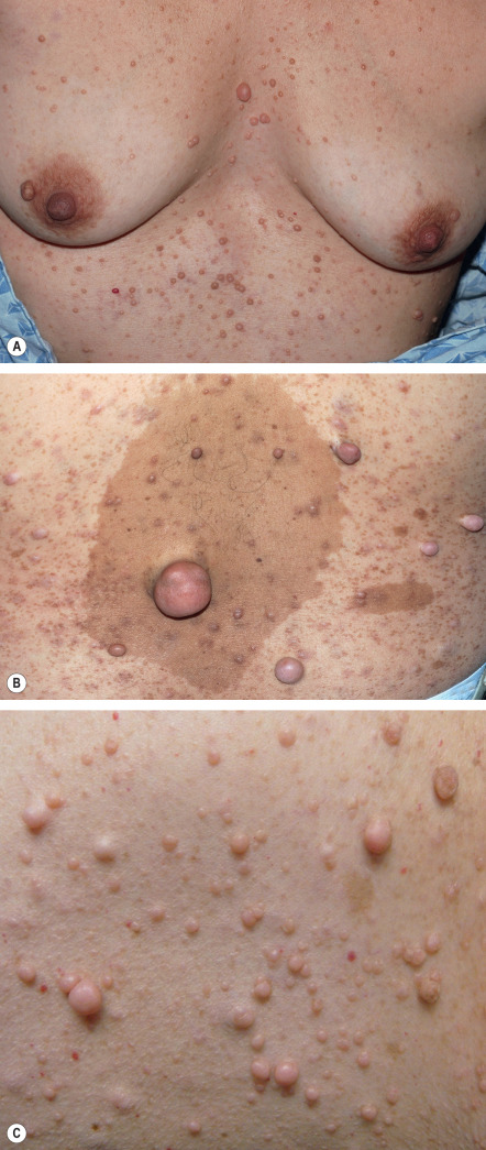 In its fullest expression, NF1 can manifest with thousands of neurofibromas in an affected individual, hence the appellation neurofibromatosis ( Fig. 61.4 ). Several variants of neurofibromas are observed in NF1. Most commonly, proliferations of spindle cells occur within the dermis, leading to cutaneous neurofibromas (CNFs). CNFs are skin-colored to pink, tan, or brown papulonodules that are soft or slightly rubbery in texture and can range from a few millimeters to several centimeters in diameter. While fully formed CNFs are often dome-shaped or pedunculated, early lesions may be barely elevated. They invaginate easily with gentle pressure, exhibiting the pathognomonic “buttonhole” sign. Although usually asymptomatic, lesions may become pruritic or, occasionally, irritated. CNFs appear as early as 4–5 years of age but more typically develop around puberty, with occasional acceleration of growth during pregnancy.