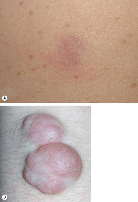 Subcutaneous neurofibromas (SNFs) occur deeper in the dermis and subcutis, tending to be firmer and less well-circumscribed than CNFs. Nearly one-fifth of NF1 patients have at least one SNF , and one-quarter of these individuals develop tumor-related local complications. Less common cutaneous presentations of neurofibromas in patients with NF1 include: (1) blue–red macules due to thick-walled blood vessels as well as neurofibromatous tissue within the papillary dermis ( Fig. 61.5 ); and (2) pseudo-atrophic macules due to replacement of collagen in the reticular dermis with neurofibromatous tissue .
