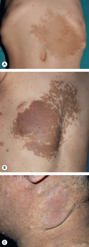 Unlike other neurofibromas, PNFs are probably all congenital in origin. Superficial and/or diffuse lesions usually become clinically apparent by the age of 4 or 5 years , while deep/internal nodular lesions may remain undetected even in adulthood unless a full-body MRI is performed . Older children without evidence of soft tissue overgrowth related to a PNF are unlikely to develop this finding later in life. Both hyperpigmentation and hypertrichosis can overlie PNFs , sometimes leading to misdiagnosis as a congenital melanocytic nevus (see Fig. 61.6 ).