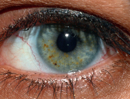 Pigmented iris hamartomas, or Lisch nodules, begin to develop at about 3 years of age and are found in ~90% of NF1 patients by 20 years of age . These 1–2 mm, dome-shaped, yellow–brown papules are best seen on slit-lamp examination ( Fig. 61.7 ). Lisch nodules rarely lead to symptoms or complications. Asymptomatic choroidal nodules are also present in 80–100% of adults and 60–70% of children with NF1, and their use as a diagnostic criterion has been suggested. However, the near-infrared reflectance imaging required for detection of these lesions may be technically challenging in younger children .