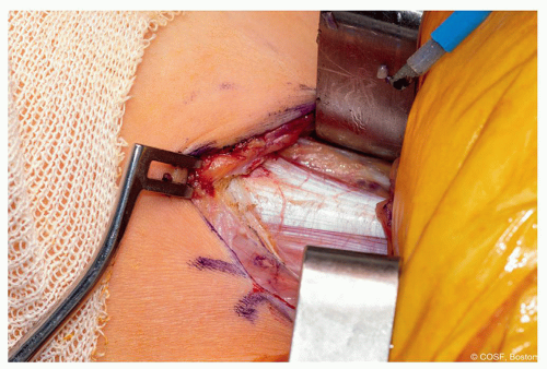 Once the tendon is identified, electrocautery is used to open the superior aspect of the sheath of the tendon, and then cranial and caudal dissection is performed to open the sheath and identify the extent of the tendon