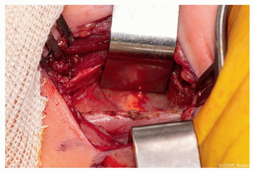 Using a combination of sharp and blunt dissection with deep Ragnell retractors, the interval is easily identified to the level of the lesser trochanter (Figure 37.3)