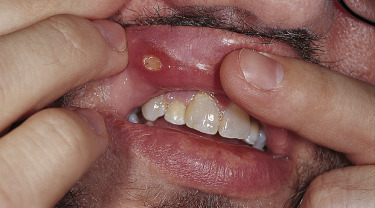 Because there is no pathognomonic laboratory test, the diagnosis is based on clinical criteria ( Table 5-1 ). The oral aphthae experienced by these patients are like those seen in patients with simple aphthosis (i.e., canker sores). They are usually multiple, painful, and occur in crops ( Fig. 5-1 ). The genital aphthae are similar, except that they occur less frequently ( Figs 5-2 and 5-3 ). Pathergy—the development of cutaneous papulopustular lesions 24 hours after cutaneous trauma (e.g., by needle prick or intradermal injection)—is a characteristic feature seen in many patients with Behçet’s disease. Various skin manifestations including vesiculopustular lesions, palpable purpura, Sweet’s syndrome-like edematous papules and PG-like ulcerations may be seen. Deeper subcutaneous lesions that mimic erythema nodosum can also occur.