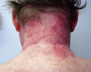 Sweet described a group of patients with one or more attacks of painful, erythematous plaques accompanied by fever, arthralgias, and leukocytosis. This syndrome is more frequent in women (female:male, 4:1) between the ages of 30 and 60 years. The characteristic lesion is a well-defined erythematous plaque often with a pseudovesicular, vesicular, or pustular surface ( Fig. 5-4 ). Lesions can occur at any location though they predominantly affect the face, trunk, and proximal extremities, and may develop at sites of trauma (pathergy). In some cases, lesions may present as deeper subcutaneous nodules with mild overlying erythema termed subcutaneous Sweet’s. Though ulceration is generally considered rare in classic Sweet’s, a new necrotizing variant with soft tissue necrosis has been reported. The lesions are accompanied by fever in most patients, and by myalgias and/or arthralgias in about half. Untreated lesions resolve over 6 to 8 weeks though recurrence may occur, especially in the setting of malignancy. Sites of extracutaneous organ involvement include bone (sterile osteomyelitis) and ocular (conjunctivitis, ulcerative keratitis) involvement as well as neutrophilic infiltration of the lungs, heart, nervous system, kidney, and gastrointestinal system.