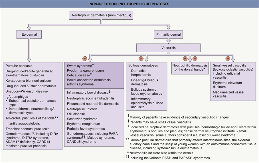 The neutrophilic dermatoses constitute a heterogeneous but linked spectrum of diseases , with significant overlapping histopathologic findings and similar pathogenic mechanisms and therapeutic approaches. They are often associated with underlying internal diseases, which may have significant morbidity and mortality. Histologically, these disorders are characterized by perivascular and diffuse neutrophilic infiltrates without any identifiable infectious agents ( Fig. 26.1 ). The cutaneous manifestations vary, from urticarial plaques and vesiculopustules to nodules and ulcers. It is noteworthy that there may be several different types of lesions in the same patient. The dermatosis may be localized or more widespread, and, in an occasional patient, similar sterile neutrophilic infiltrates may occur in other organs including the eyes, joints, bones, lung and kidney. The neutrophilic infiltrate may be most prominent in the epidermis, dermis, or even the panniculus. Distinct entities have been defined by the nature of their clinical and histologic presentations as well as their associated diseases.