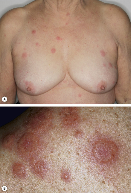 The initial cutaneous lesions are tender, non-pruritic, erythematous plaques or papules, which may enlarge or coalesce to form plaques with an uneven mammillated surface ( Figs 26.2 & 26.3 ). Because of the pronounced associated edema, the lesions may have a pseudovesicular or pseudopustular appearance; however, some patients actually do develop vesiculation, bullae or pustules within their plaques. Occasionally, the plaques have a central yellowish discoloration creating a targetoid appearance. A facial erysipelas-like appearance has also been described as has a giant cellulitis-like variant. The vesiculobullous variant, which is most frequently associated with acute myelogenous leukemia, can progress to ulceration resembling superficial pyoderma gangrenosum (PG). In this form, there may be a single lesion or multiple, asymmetrically distributed lesions.