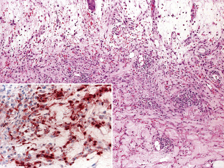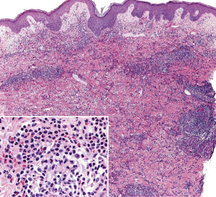 Three histologic variants of Sweet syndrome, histiocytoid, lymphocytic and eosinophilic, have been increasingly recognized. The histiocytoid variant is characterized by a dermal, and sometimes subcutaneous, infiltrate composed of histiocyte-like immature myeloid cells . These cells have myeloperoxidase activity ( Fig. 26.6 ) and must be distinguished from those of leukemia cutis. The lymphocytic variant is often associated with, and sometimes precedes, underlying myelodysplasia . More recently, an eosinophilic variant has been described .