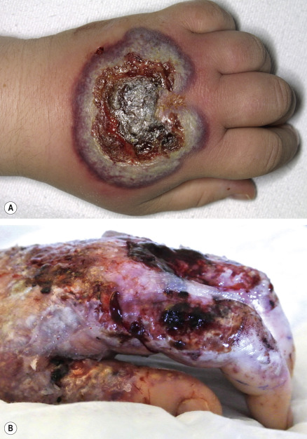 Patients with neutrophilic dermatosis of the dorsal hands develop tender, erythematous to violaceous plaques that may become bullous or ulcerative ( Fig. 26.7 ) . There is a spectrum of associated histologic features, from pustular vasculitis to those of PG or Sweet syndrome. Hence, some authors consider this to be a variant of Sweet syndrome.
