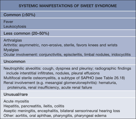 In 1986, Su and Liu proposed two major and four minor criteria for the diagnosis of Sweet syndrome, which have been widely accepted and are shown with minor revisions in Table 26.4 . The differential diagnosis of the syndrome depends on the nature and age of the lesions and on the associated disorder ( Table 26.5 ; see Fig. 26.1 ).