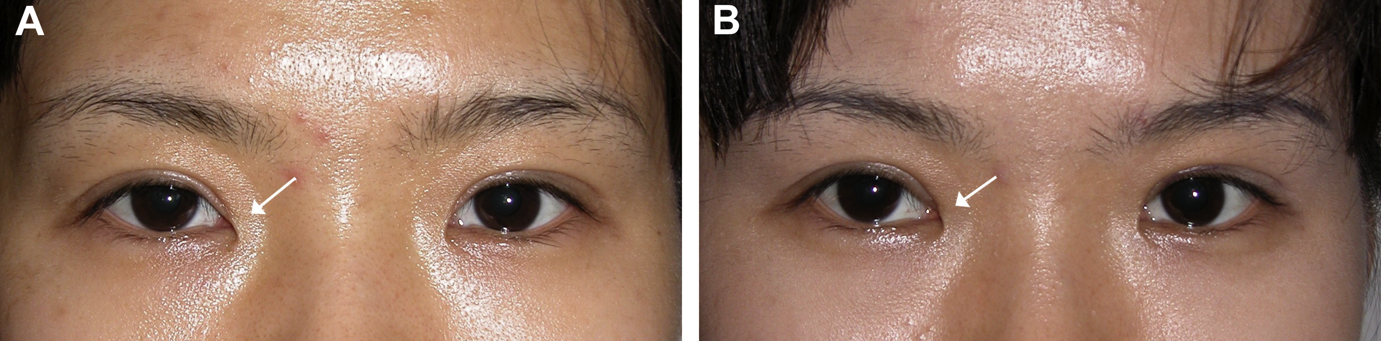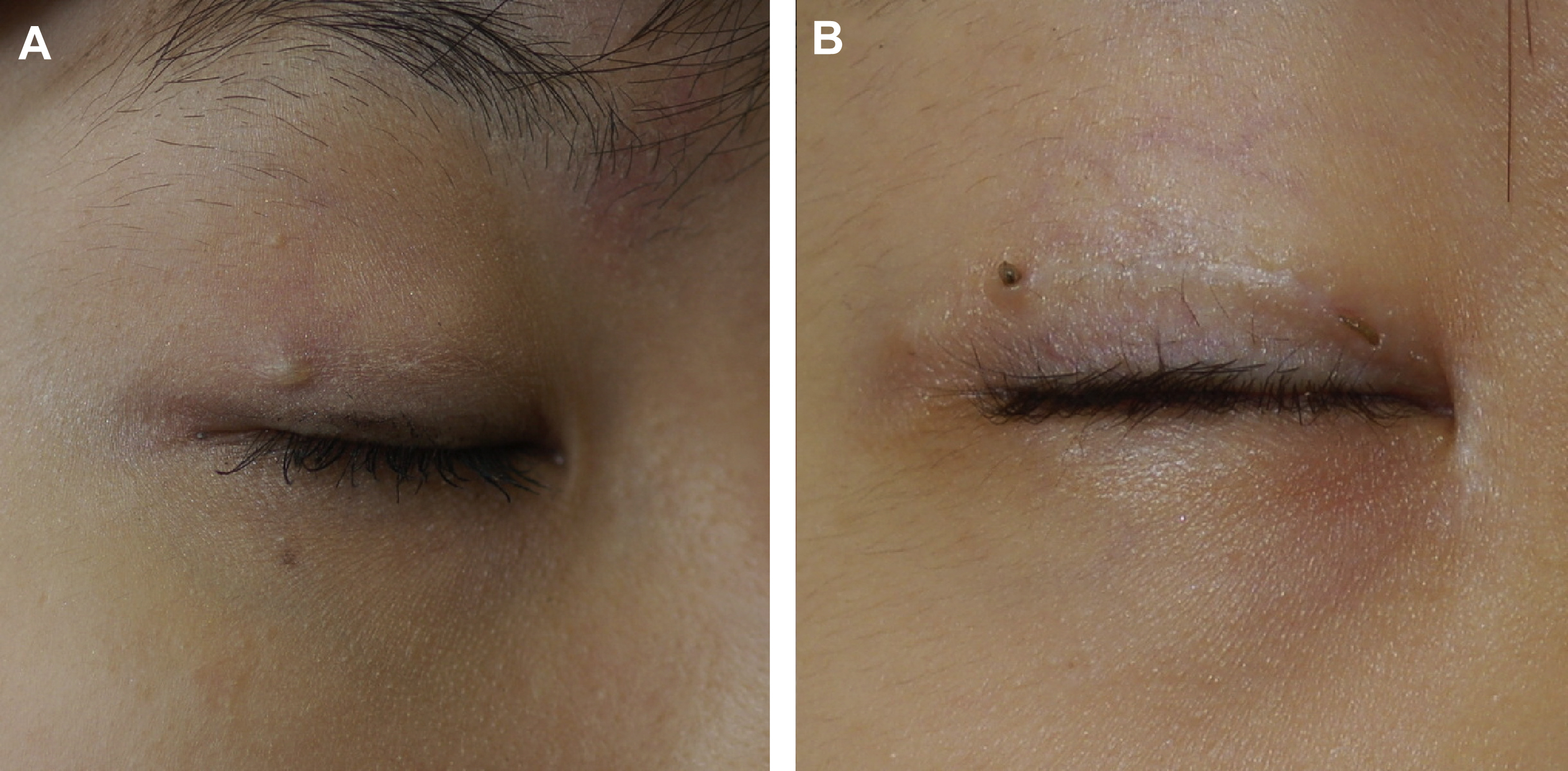 The incisional and nonincisional techniques have their own advantages and disadvantages. The nonincisional technique (suture method) is preferred over the incisional technique because it provides a more natural appearance, is a simple and easy technique, causes only mild swelling and less scarring postoperatively, and enables a fast recovery. The disadvantages of the nonincisional technique are the inability to completely deal with preaponeurotic fat and soft tissue, which leads to the possibility of disappearance of the double eyelid crease, and development of inclusion cyst or exposure of a knot because of a buried suture ( Fig. 3 ).