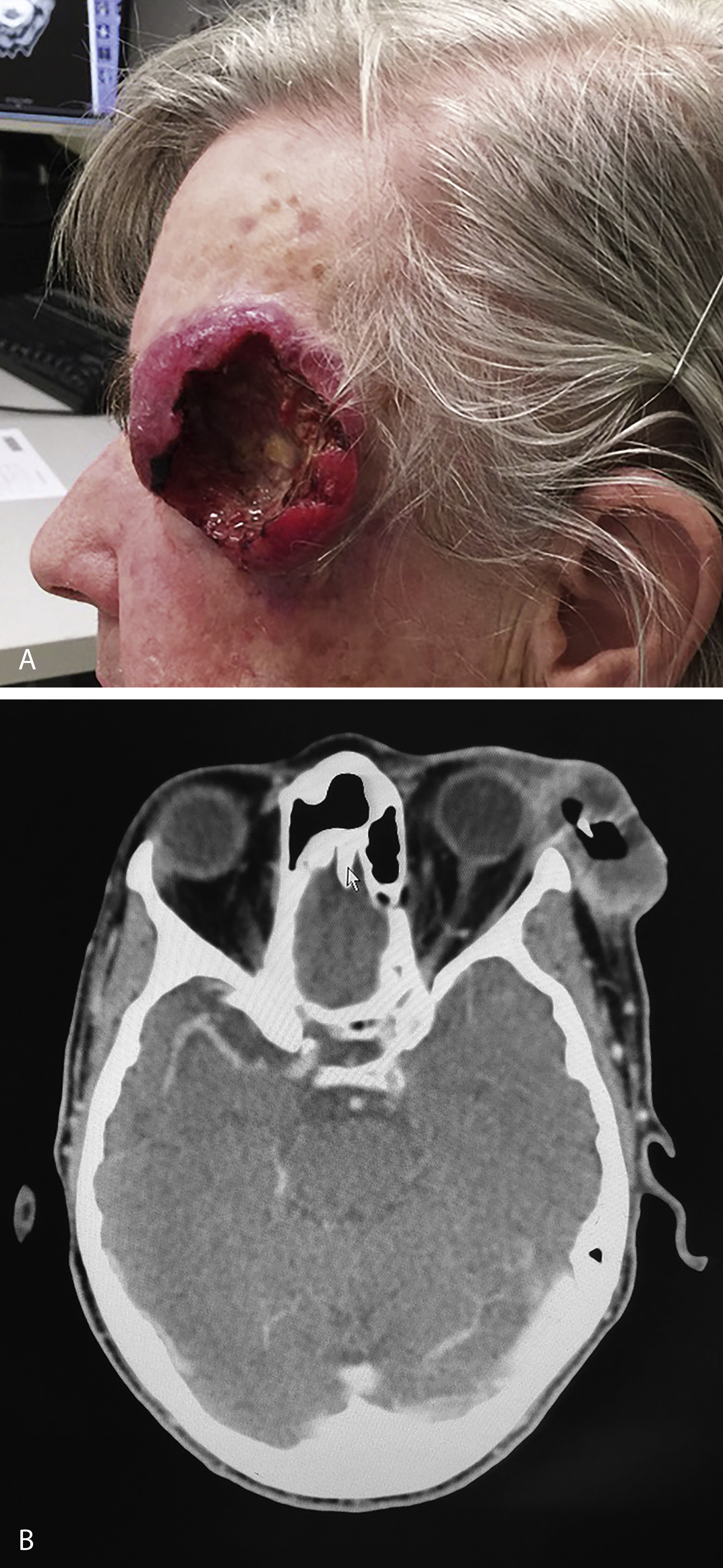 BCC is a cutaneous malignant proliferation which is derived from basaloid cells. Basal cell carcinomas grow slowly, whereby the doubling time is 6–12 months. Individuals presenting with a BCC are at increased risk of having more lesions at the time of diagnosis and a 3-year cumulative risk for a second primary of 44% (10-fold increase over the general population). They can be locally invasive, involving subcutaneous tissue, muscle, and bone ( Figs. 9.2 and 9.3 ). Micronodular, morpheaform or infiltrative BCCs are more likely to recur after treatment. Long-term follow-up and annual skin examinations are warranted in those with a history of BCC, as they are also at an increased risk of developing other skin cancers. BCCs exhibit stromal dependence where tumor cells cannot engraft elsewhere without being transplanted along with adjacent stromal cells. Correspondingly, the incidence of metastasis is reported to be less than 0.55% and is associated with larger primary tumor size, greater depth of invasion, previous irradiation and central facial position rather than tumor subtype. When metastasis occurs, lymph nodes and lungs are the most commonly involved. Since 1981, 238 cases of metastatic BCC have been reported, most of which occurred in middle-aged men with an average tumor size of 7.5 cm and a median time of 9 years between primary tumor and first sign of metastasis. Once metastasis does occur, the median survival is 10 months.