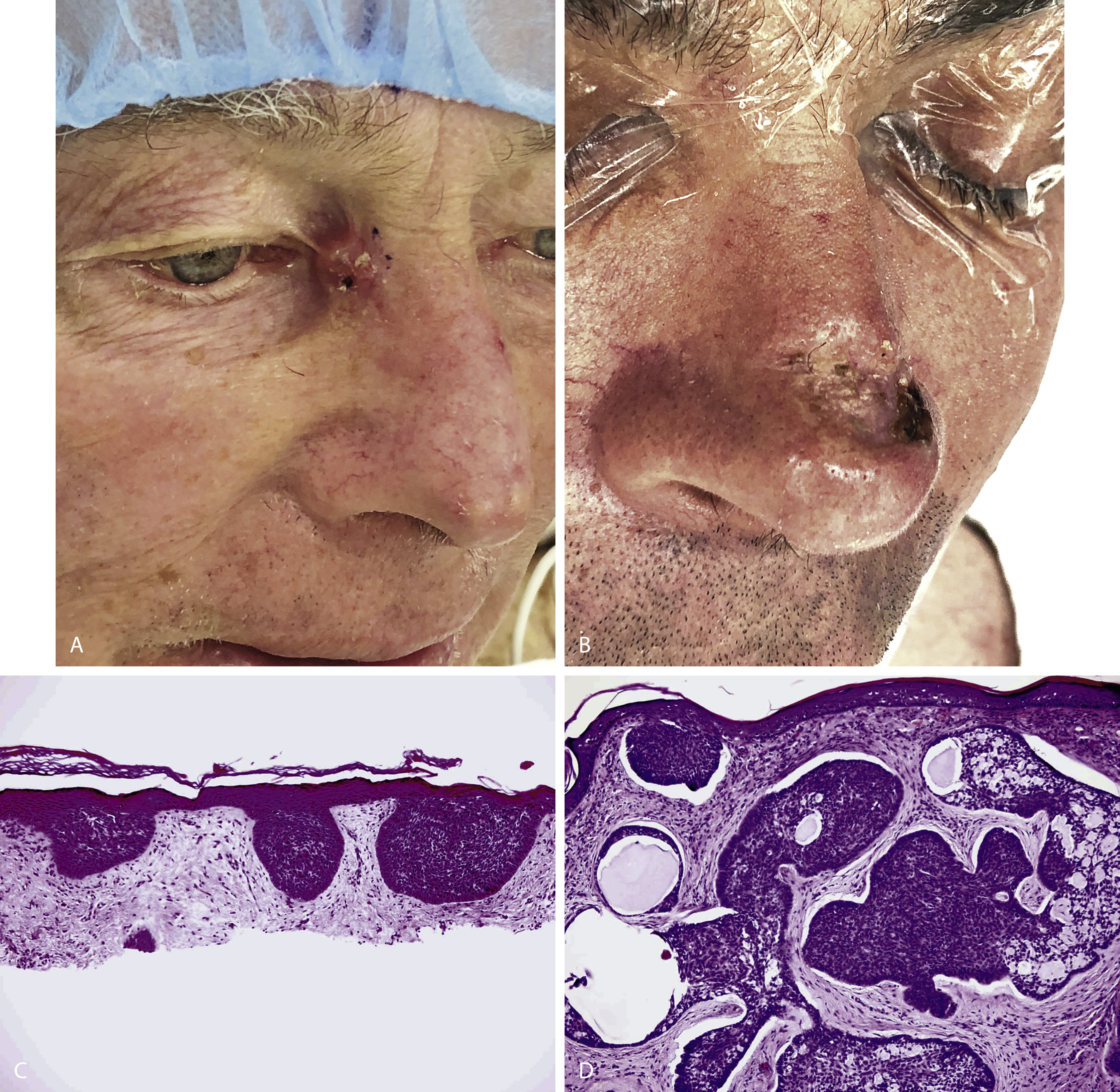| Micronodular | Multiple erythematous macule or thin papule/plaques most commonly found on the back. Nodules do not appear to be contiguous | Multiple small basaloid nests within the dermis. Individual nests are part of a complex network of intercommunicating tumor processes. May exhibit infiltration into surrounding tissues |
