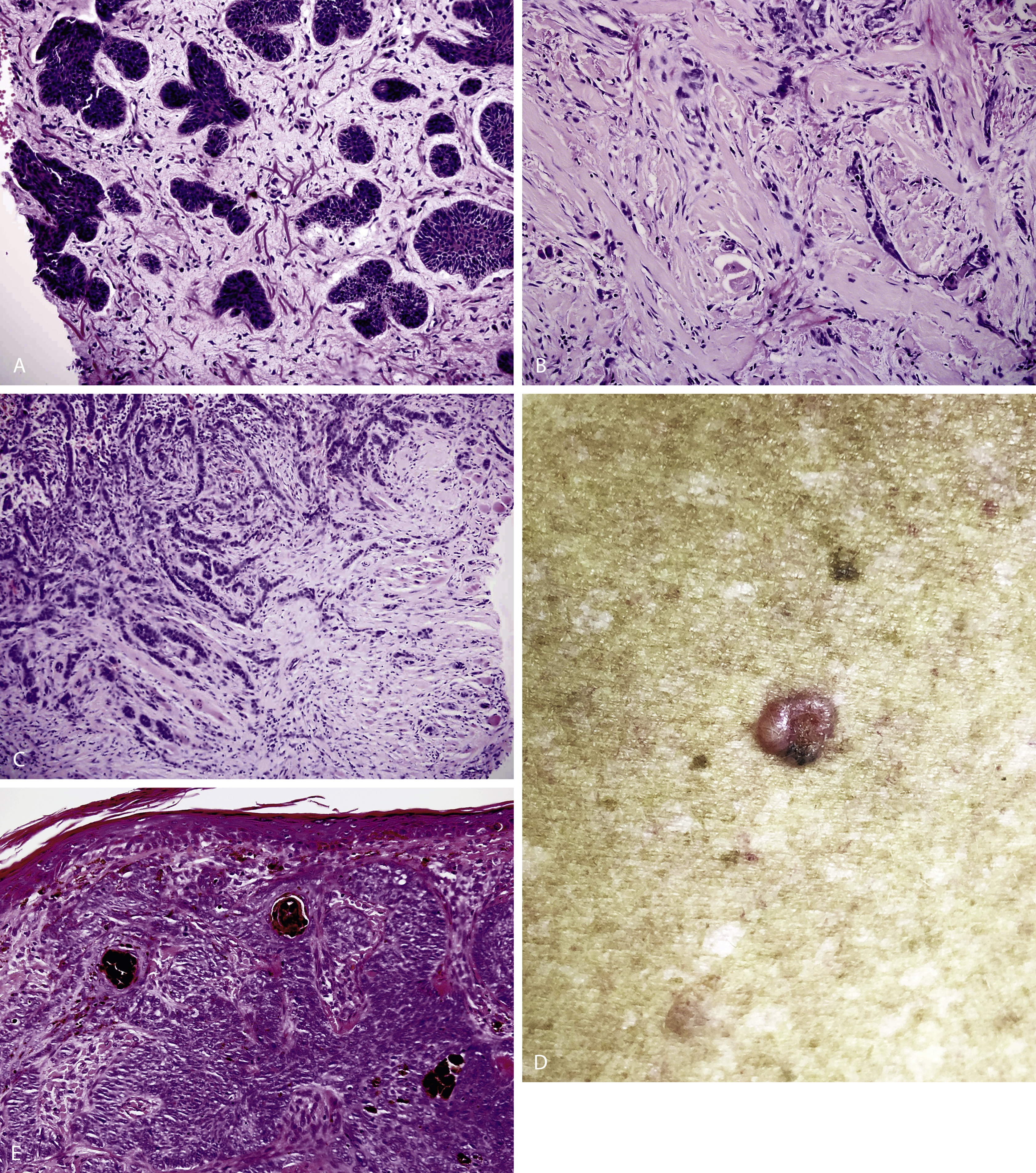Definitive diagnosis is made on histology following a punch, shave or excisional biopsy of the lesion. Histology of superficial BCC ( Fig. 9.4C ) usually reveals a basophilic tumor (blue) on standard hematoxylin and eosin staining. Buds of basaloid cells extend from the epidermal basal layer into the reticular dermis. Nodular BCCs ( Fig. 9.4D ) have nests of large basaloid cells with peripheral palisading in the papillary or reticular dermis. They may demonstrate peri-nest clefting consistent with retraction from surrounding stroma but this is usually a processing artifact. Micronodular BCC ( Fig. 9.5A ) is composed of multiple microscopic nodules smaller than 15 μm making it difficult to interpret tumor clearance when there are close margins. Tumors become infiltrative ( Fig. 9.5C ) when basaloid islands lose their epidermal connections and invade the underlying dermis, often as sheets or finger-like projections of tumor cells without much stromal reaction. In contrast, morpheaform BCC ( Fig. 9.5B ) consists of strands of tumor cells extending deeply into the dermis embedded within a dense fibrous stroma. Pigmented BCCs ( Fig. 9.5E ) have similar histology to the nodular subtype with numerous melanocytes among the tumor nests and melanophages in the stroma