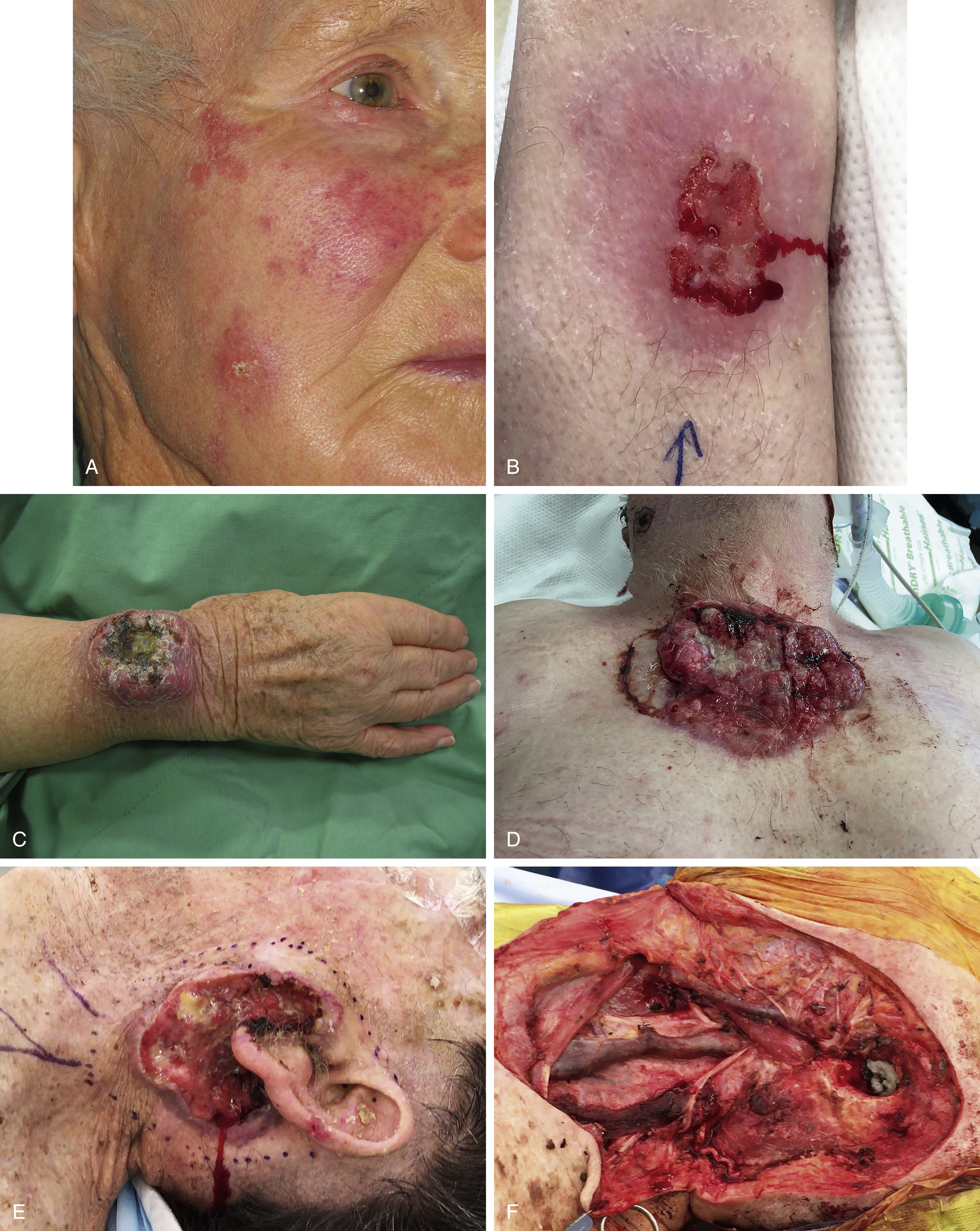 SCCs typically arise in sun-exposed sites, namely the head, neck, ears, dorsal hands, lips, and legs. The head and neck are the most common sites of occurrence for SCC in men, while the upper limbs followed by head and neck are the most common sites in females. In those with higher Fitzpatrick skin types, they may arise on both sun-exposed and protected sites. SCCs usually present as a changing solitary lesion developing from a pre-existing AK or Bowen’s disease. AKs ( Fig. 9.6A ) appear as multiple ill-defined scaly erythematous macules, papules or plaques ranging in size from 2 mm to >2 cm, whereas Bowen’s disease ( Fig. 9.6B ) is usually a well-defined solitary patch/plaque. Both of these precursor lesions can be confused with eczema or psoriasis, however they are typically asymptomatic and do not respond to topical steroids. The development of tenderness, increased size or scale and erosions may represent progression to SCC. In the setting of immunosuppression, multiple SCCs may develop in an eruptive fashion.